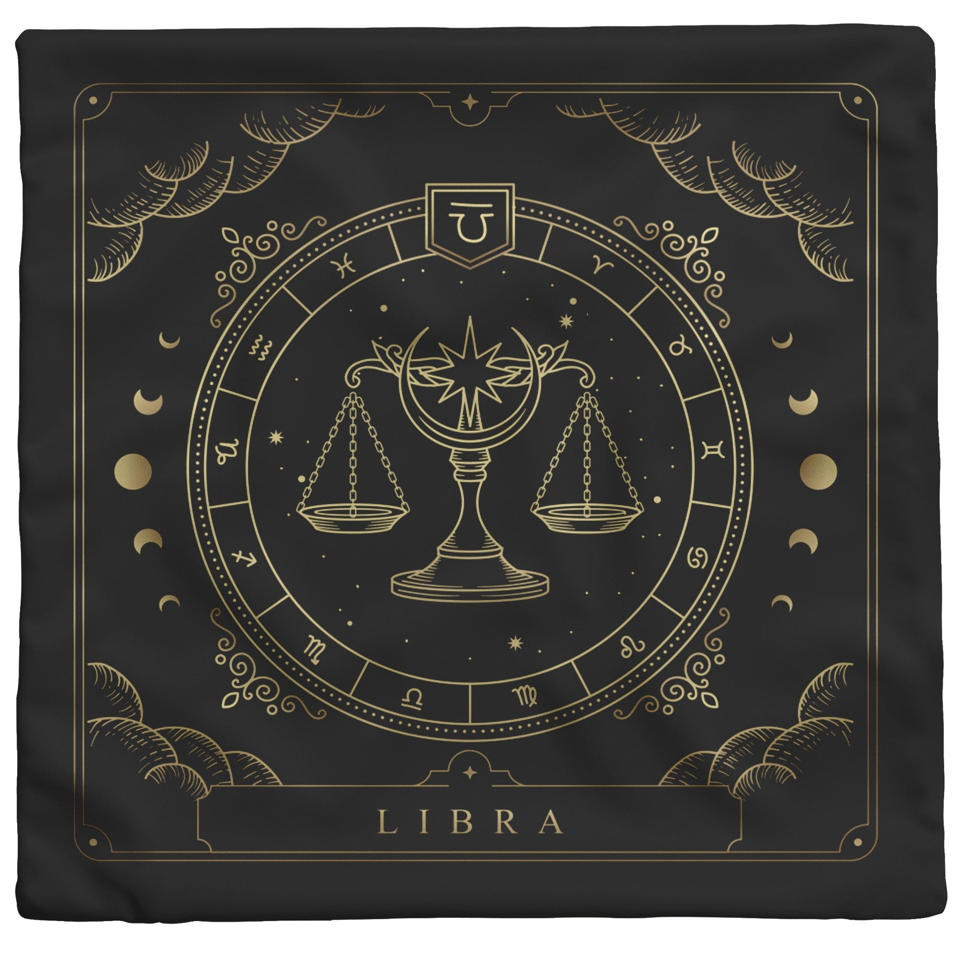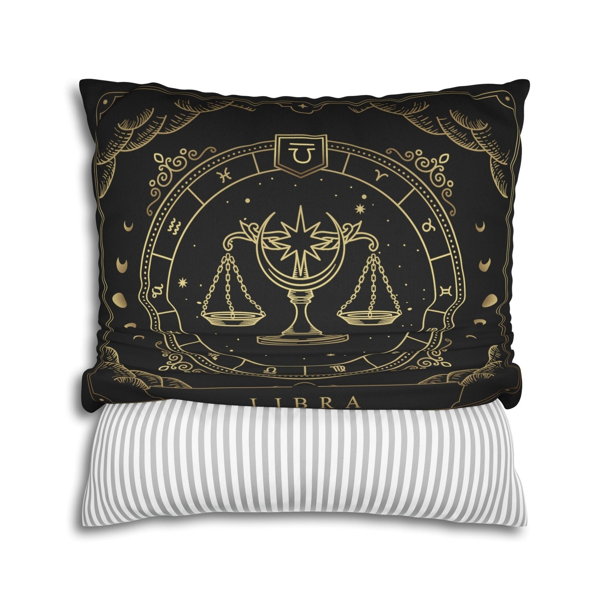 Bring some balance and harmony to your space with this beautiful and cozy throw pillow. This pillow features the zodiac symbol of Libra, the scales, in a tarot-inspired design in gold artwork on a black background.