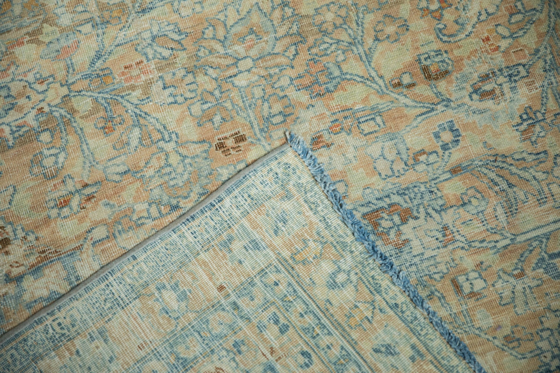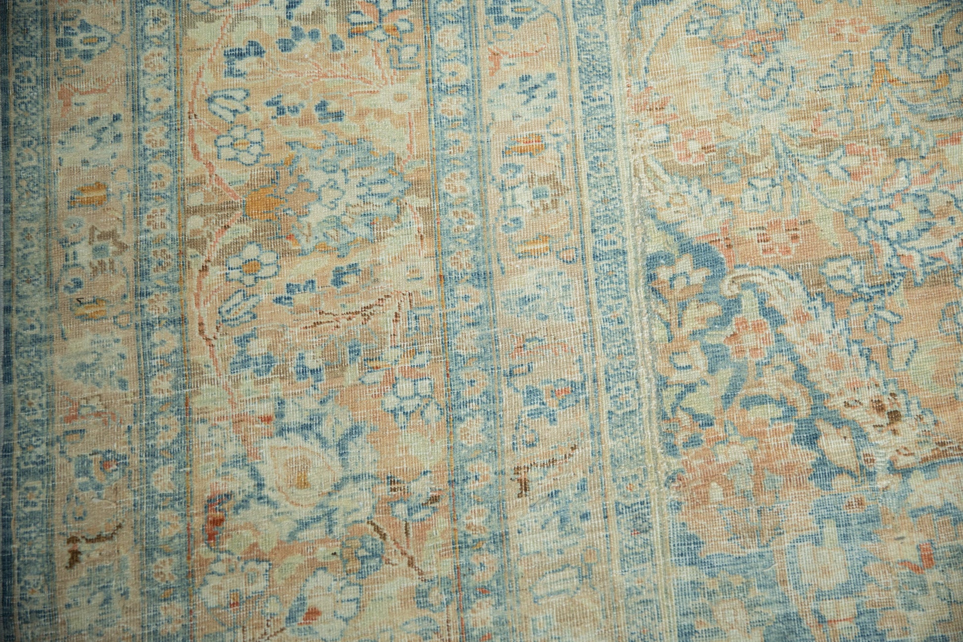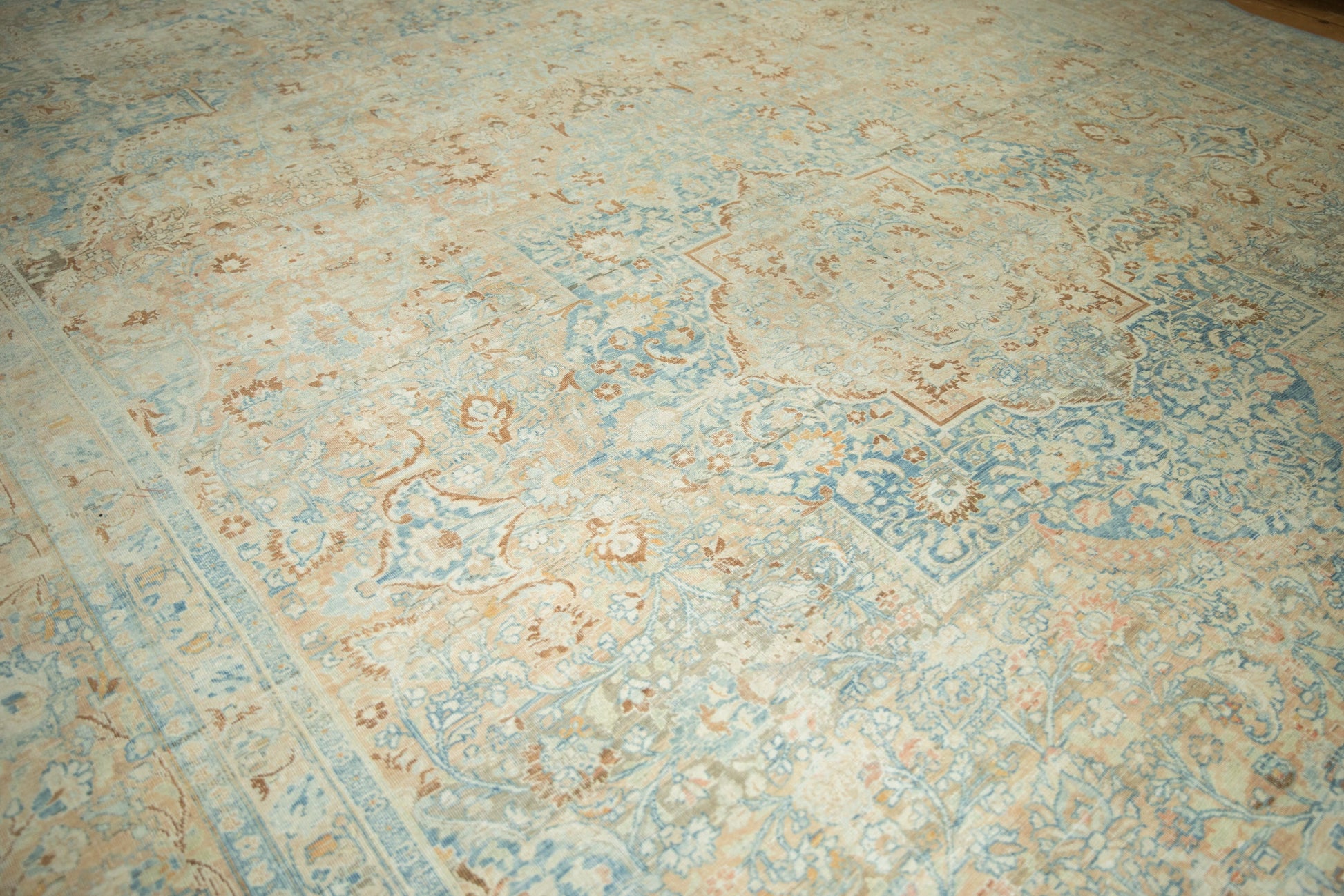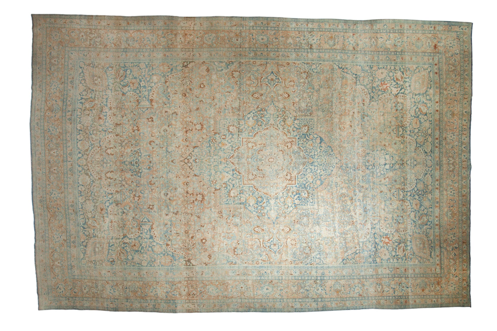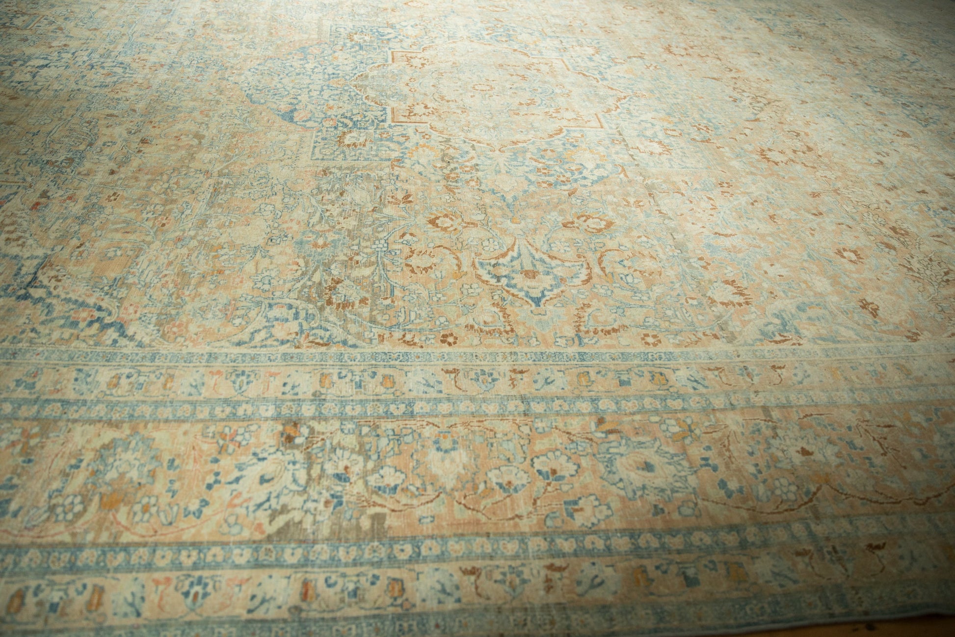 :: Concentric center medallions with interior floral blossom design and quatrefoil orientation atop a covered field of minor blossoms with corner spandrel overlays loosely reciprocating the contour of the main medallion. Colors and shades include: Dusty apricot, pale sky blue, powder blue, ivory, copper, pale tangerine orange, and more. Condition notes: Even wear across to knot heads with faint foundation showing through. Most of the original side cord selvages are intact or restored. Fully secured sides and ends. One end measures approximately 11'4", within normal margins of a hand knotted rug of this size. Recently professionally cleaned ready for in-home use! Many years of enjoyment to come with this hand knotted Persian Khoy carpet made in Persia circa 1930's vintage. Size measures 11'9" x 17'3".