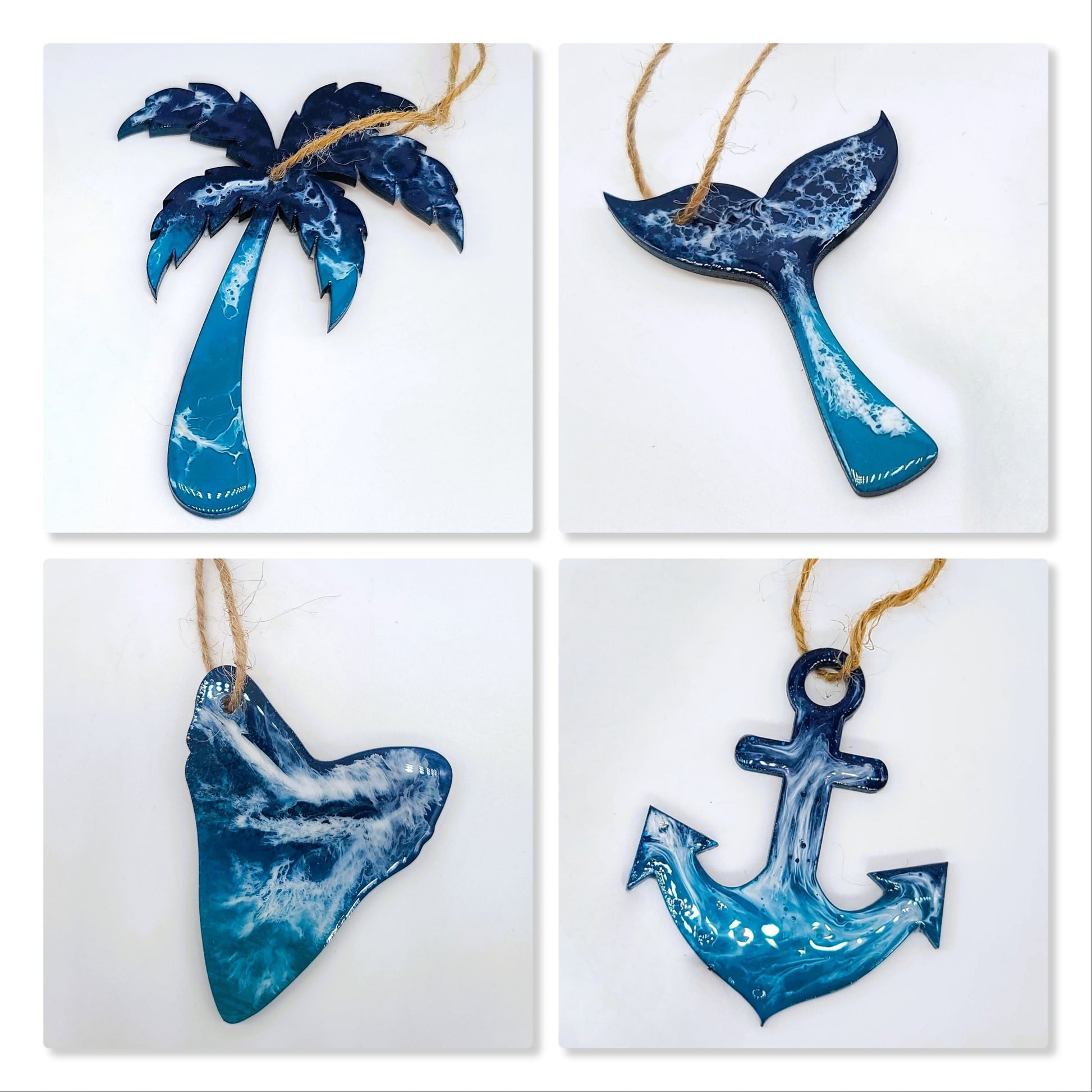14 Handmade Resin and Wood Christmas Ornament/Ocean/Beach/Sealife -Shark, Whale Tail, Mantaray, Mermaid Tail, Starfish, Sand Dollar, Seashell.
