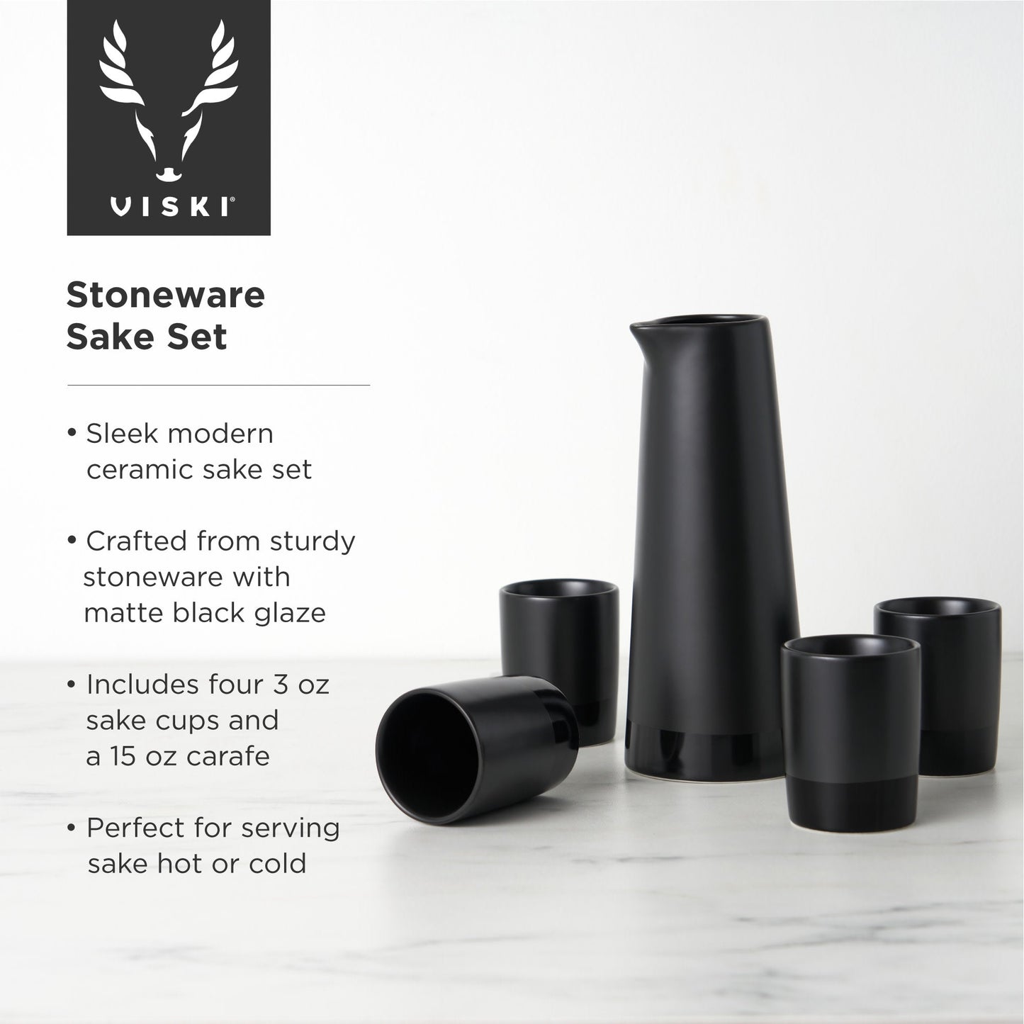 Black doesn't go out of style. In our classic five-piece sake set, jet-black stoneware is overlapped by a glossy obsidian base on each piece, forming a flawless horizon across four cups and a traditional serving carafe.