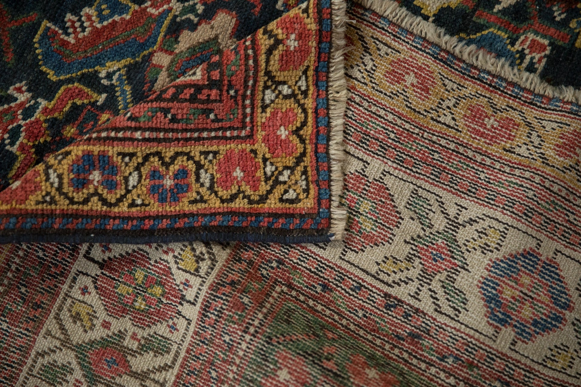 :: Allover covered field in a Herati style design motif with geometric contouring. Highly colorful range of shades, all in great brilliance and vivid clarity. Colors and shades include: Navy blue, madder root red, forest green, dusty saffron yellow, rust, gold, ivory, beige, sand, and more. Condition notes: Even wear across to knot heads. Most of the original side cord selvages are intact or restored. Fully secured sides and ends. Full end restoration to outer, inner and main border approximately 15". Recently professionally cleaned ready for in-home use! Many years of enjoyment to come with this hand knotted Persian Mahal carpet made in Persia circa 1910's vintage. Size measures 6'7" x 9'1".