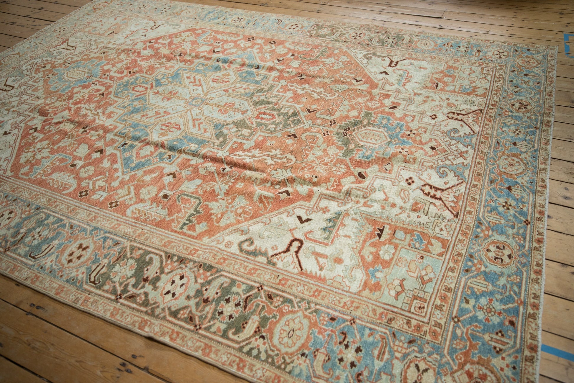 :: Oversize concentric starburst medallions with large scale finials atop a covered field of expressive scrolled multi colored leaves and geometric blossoms. Colors and shades include: Terracotta, dusty powder blue, charcoal, oxidized silver, sky blue, and more. Condition notes: Even wear across to knot heads with faint foundation showing through. Fully secured sides and ends. Machine bound sides. Recently professionally cleaned ready for in-home use! Many years of enjoyment to come with this hand knotted Persian Heriz carpet made in Persia circa 1950's vintage. Size measures 7'8" x 10'8".