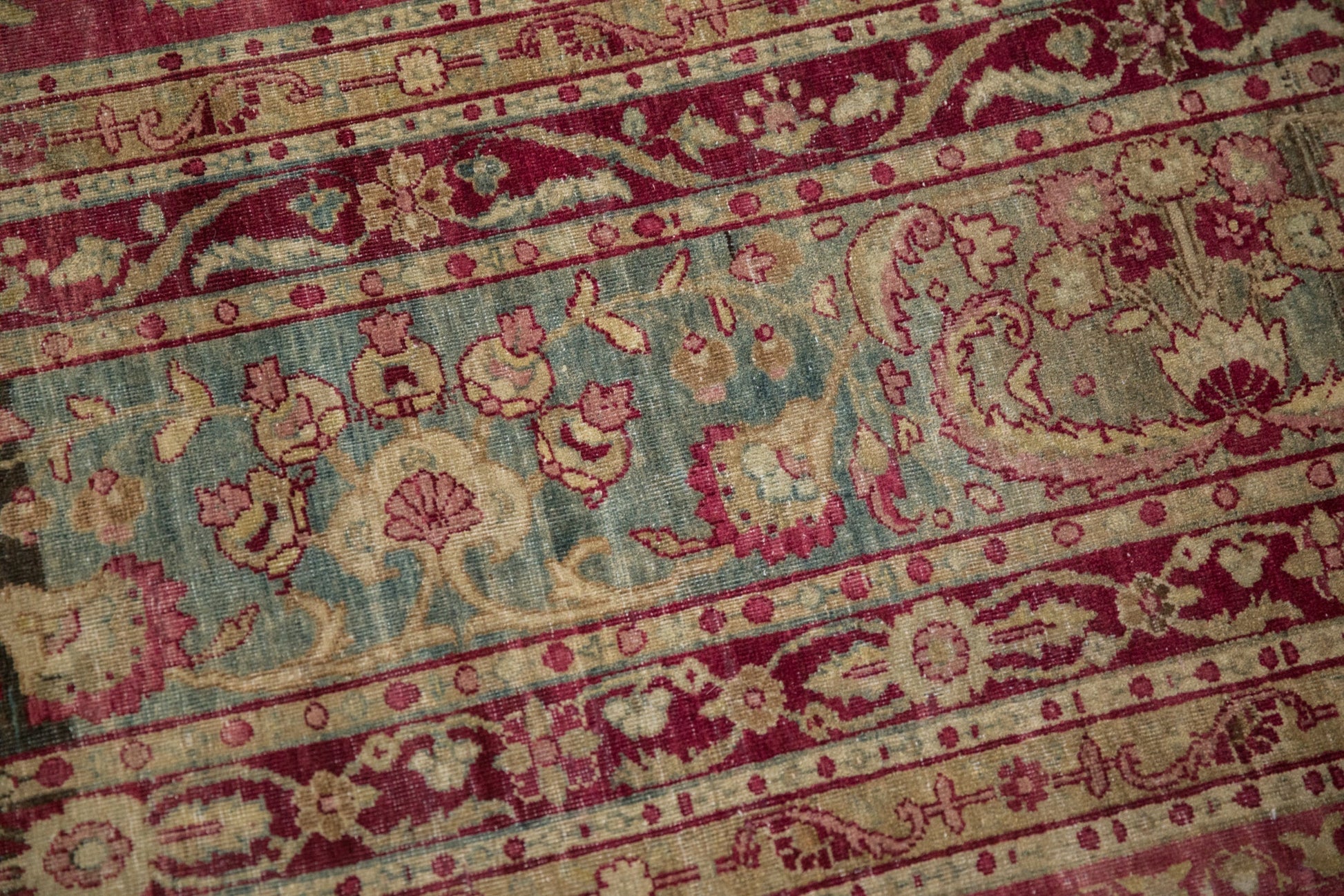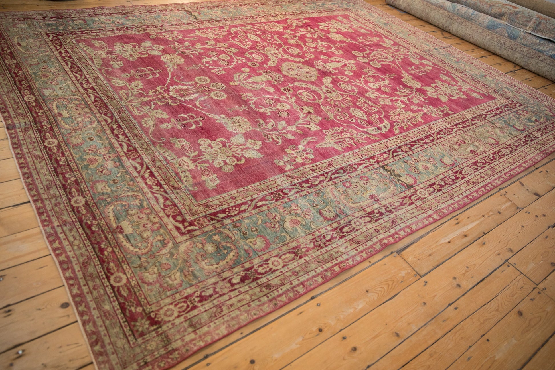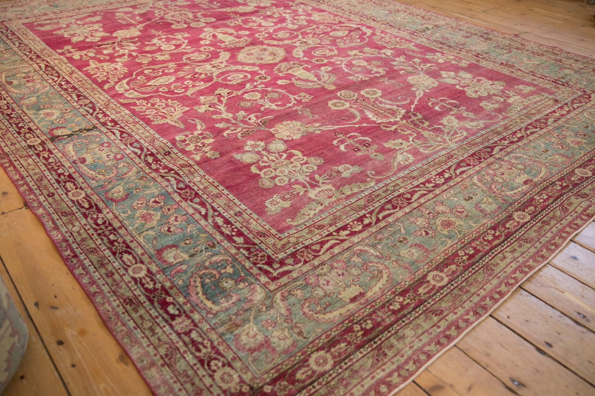 :: Sprawling covered field in delicate vines, blossoms and floral sprays atop an unusual raspberry magenta abrashed ground main field. Gorgeous details throughout and heavy European influence with a deep fusion of timeless Persian design. Colors and shades include: Magenta, raspberry red, ivory, jade green, ivory, beige, dusty teal, sand, pale coffee brown, dusty rose, faded cochineal red and more. Condition notes: Even wear across to knot heads with faint foundation showing through. Most of the original side cord selvages are intact or restored. Fully secured sides and ends. Recently professionally cleaned ready for in-home use! Many years of enjoyment to come with this hand knotted Persian Yezd carpet made in Persia circa 1920's vintage. Size measures 8'8" x 11'3".