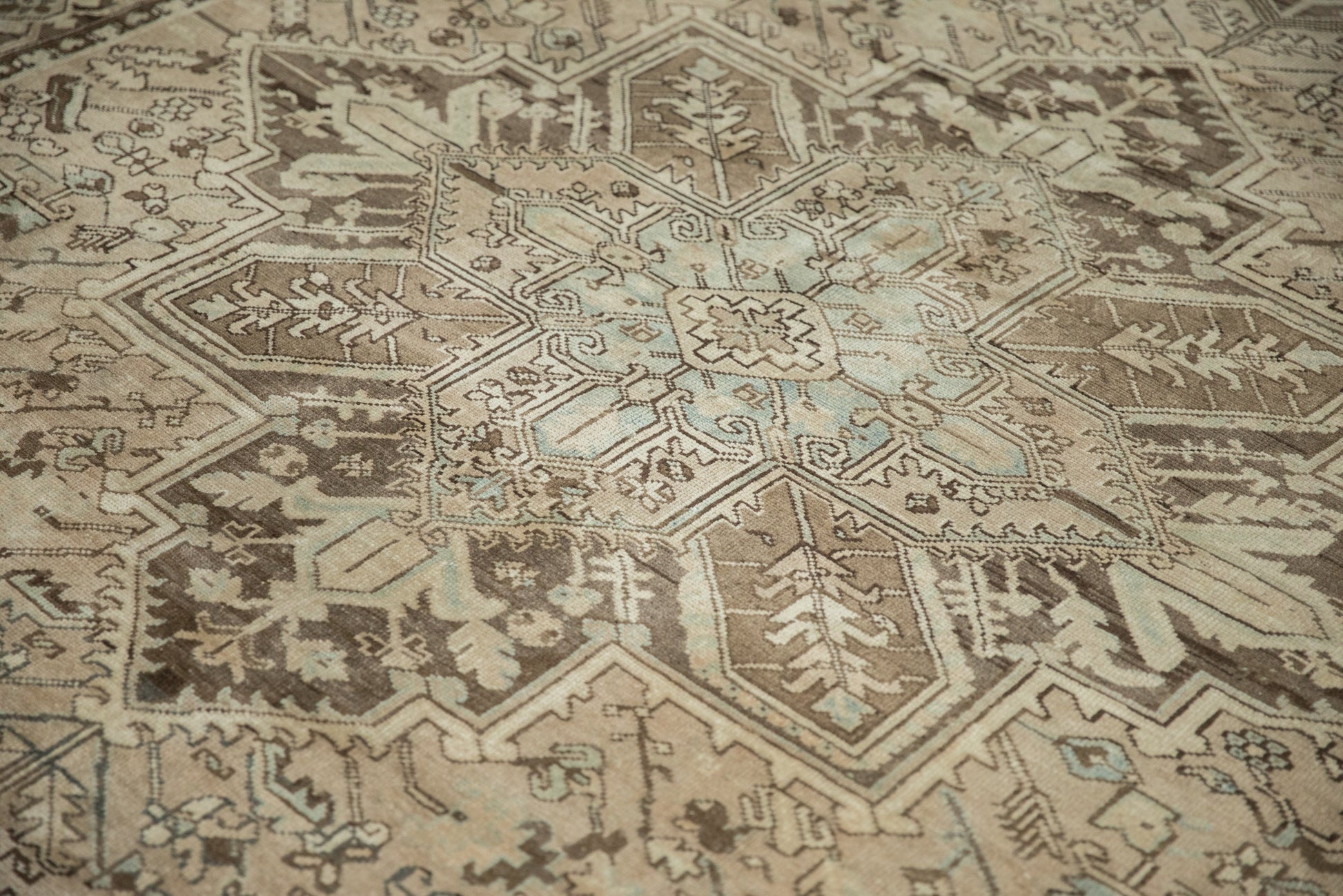 :: Concentric oversize center medallions in quatrefoil orientation adorned with geometric finials and outwardly directed germinating buds atop a covered field of serrated leaves, thin vines and minor blossoms. Abrashes across. Colors and shades include: Antique ivory, beige, pale charcoal, oxidized silver, silver, dusty slate powder blue, sand and more. Condition notes: Even wear across to knot heads with faint foundation showing through. Most of the original side cord selvages are intact or restored. Fully secured sides and ends. Recently professionally cleaned ready for in-home use! Many years of enjoyment to come with this hand knotted Persian Mehrivan carpet made in Persia circa 1950's vintage. Size measures 8'1" x 10'10".