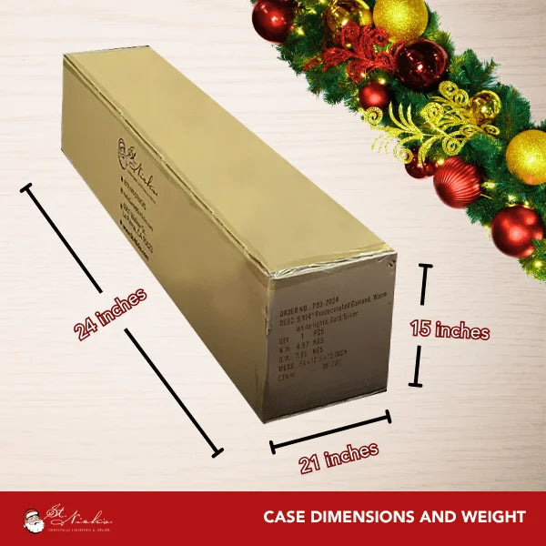 Create a warm and inviting atmosphere with our Predecorated Green Garland. Featuring a combination of red, gold, and burgundy ornaments, expertly arranged and illuminated by warm white lights, this garland brings a touch of elegance to your Christmas display. It's the perfect choice for decorating mantels, staircases, or entryways.