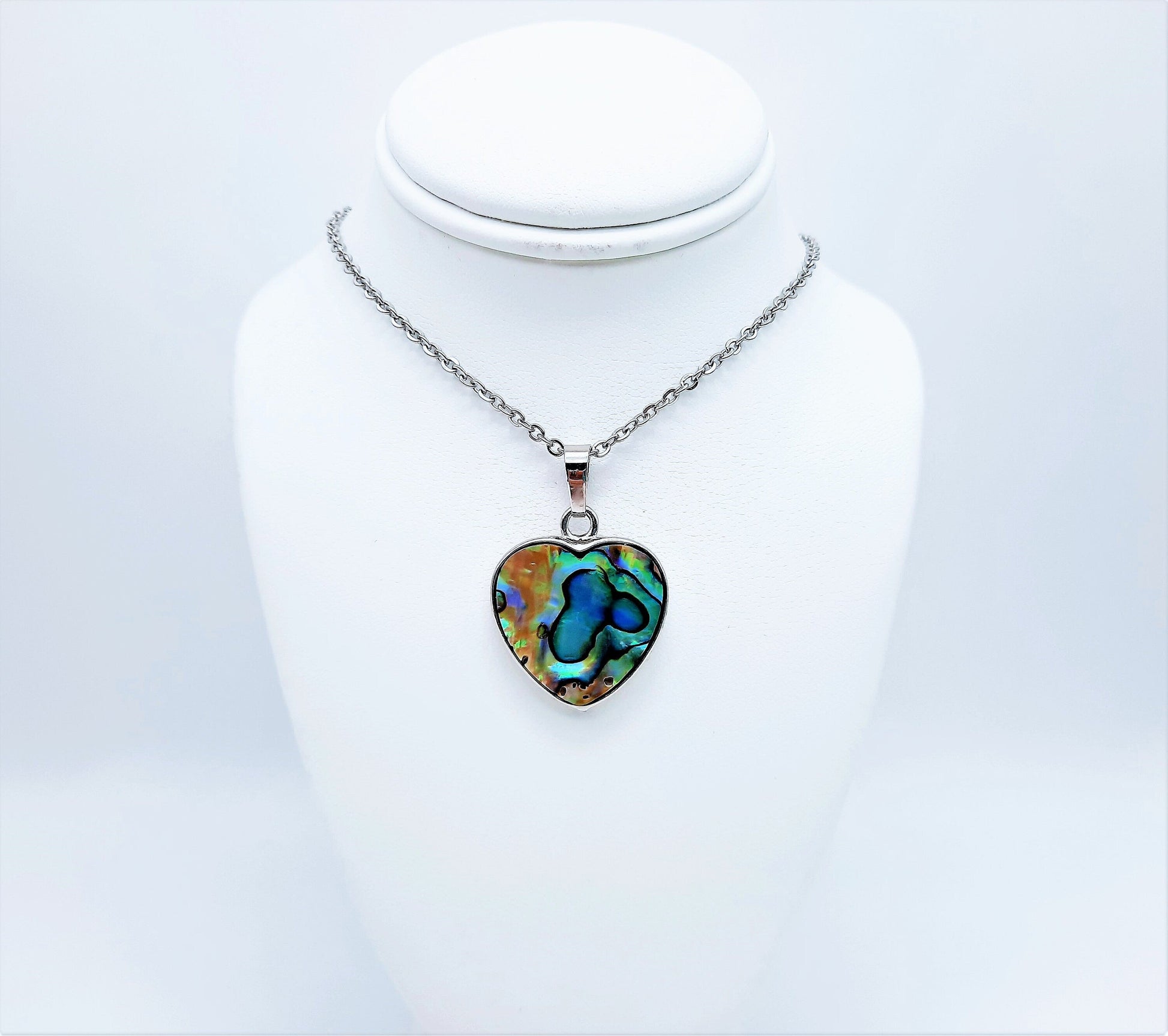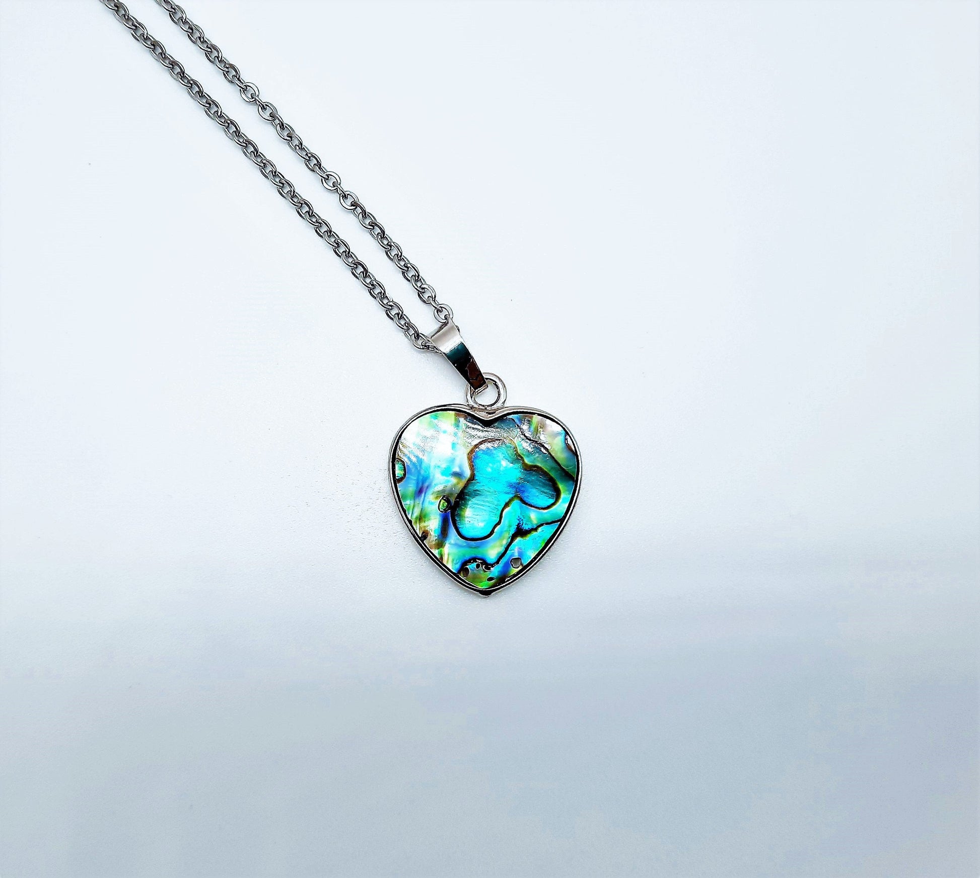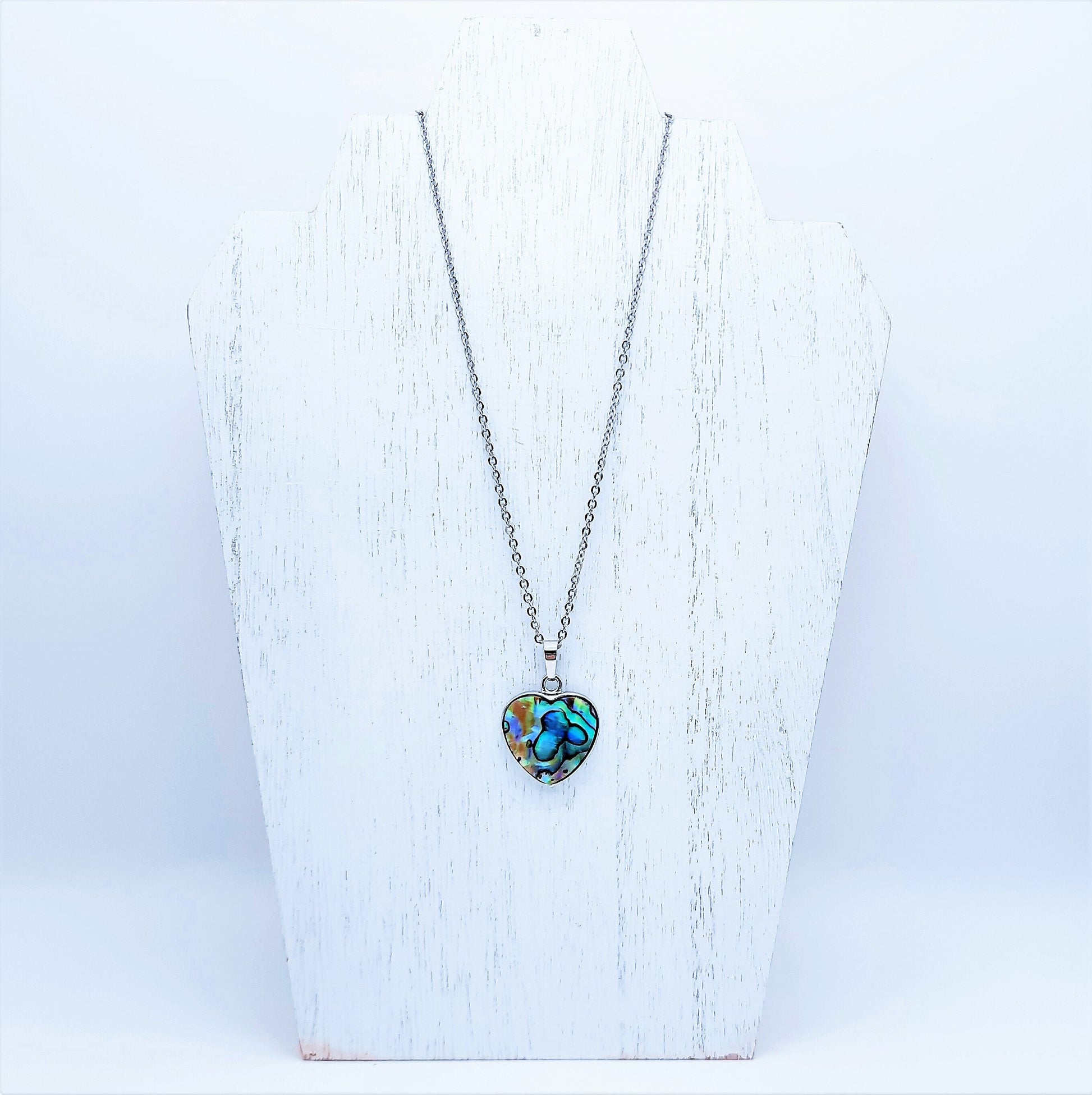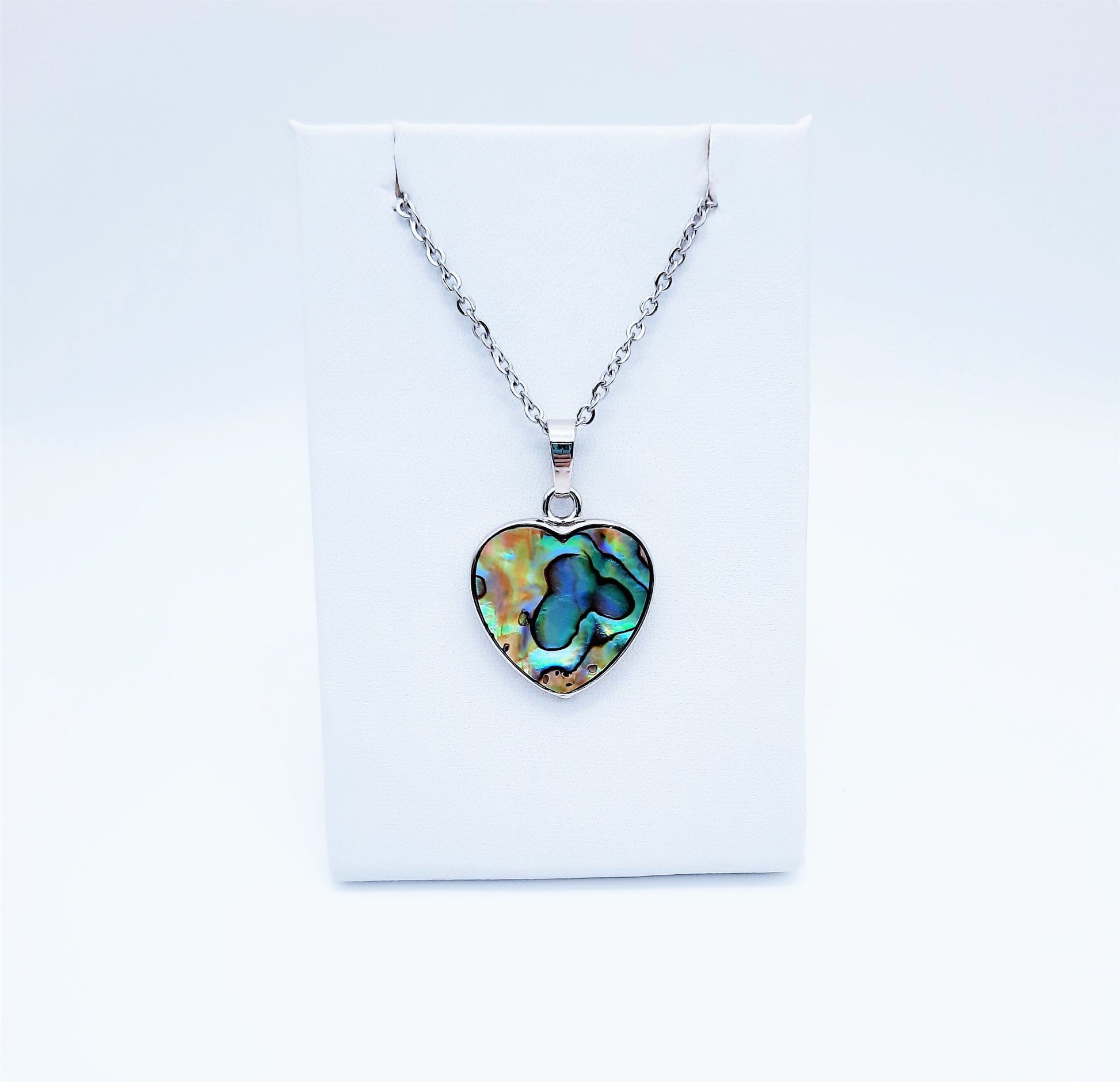 Abalone/Paua Seashell Heart Pendant Necklace - Stainless Steel Hypoallergenic Chain - Lobster Claw Closure - Silver-Coated Brass Pendant.