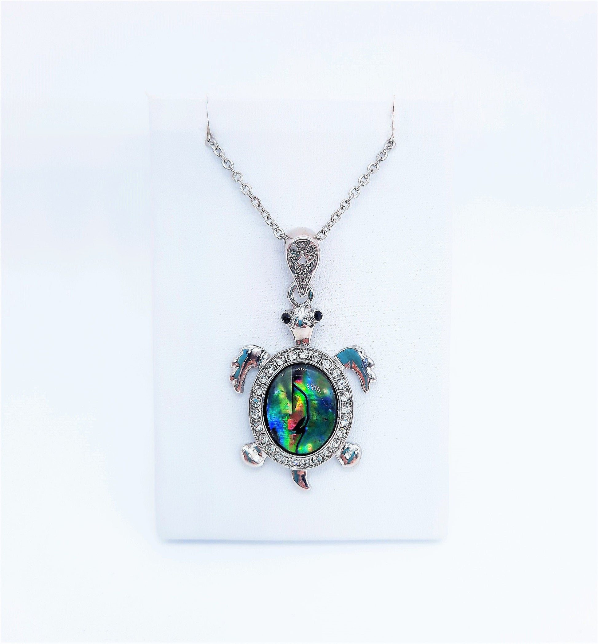 This pendant boasts a metallic frame shaped like a sea turtle, surrounded with crystal rhinestones; the top of the turtle boasts a large piece of iridescent, blue-green abalone shell that shimmers and changes in the light. Comes with an 18" stainless steel chain with lobster claw closure.