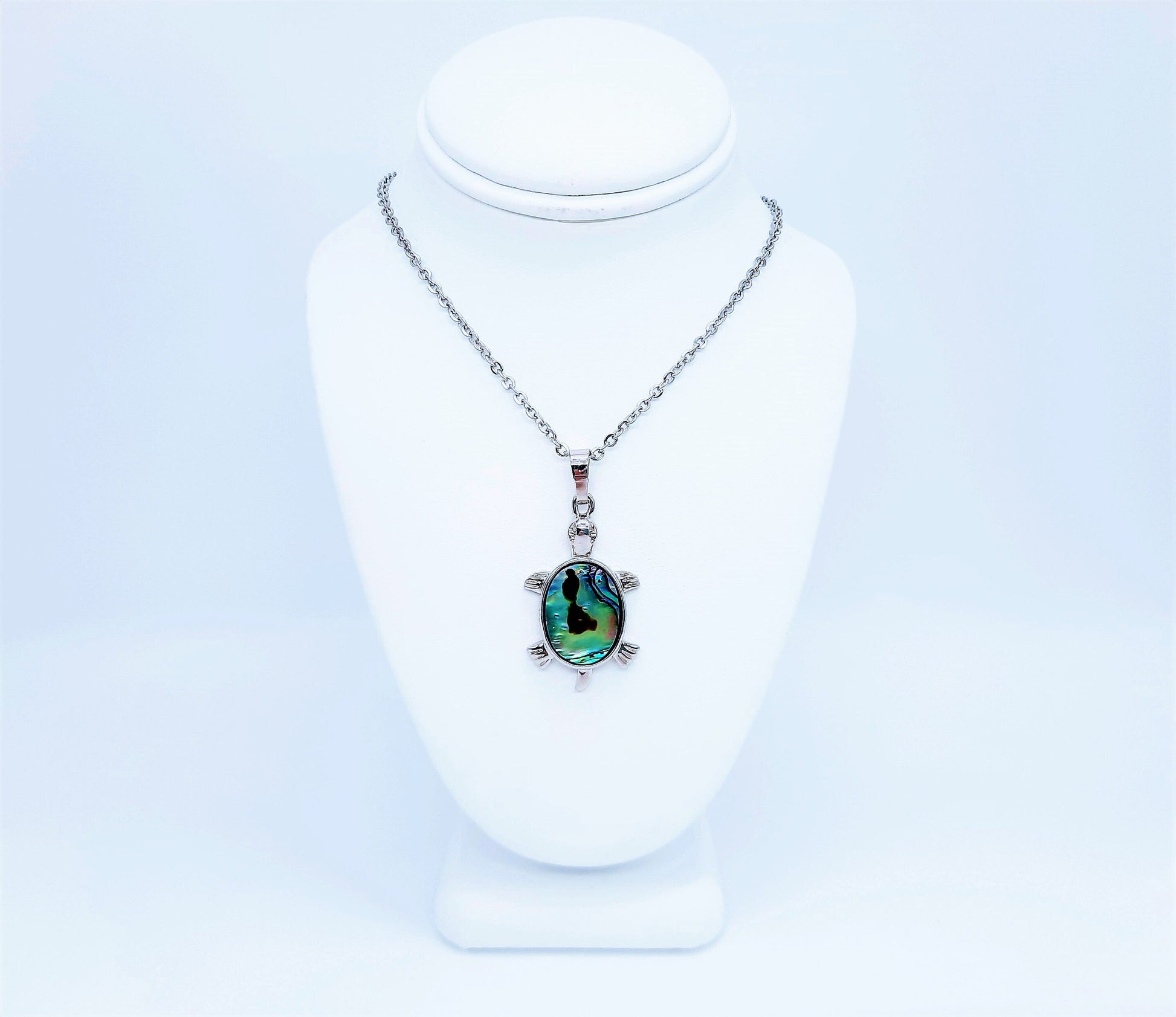 This pendant boasts a metallic frame shaped like a turtle; the top of the turtle boasts a large piece of iridescent, blue-green abalone shell that shimmers and changes in the light. Comes with an 18" stainless steel chain with lobster claw closure.
