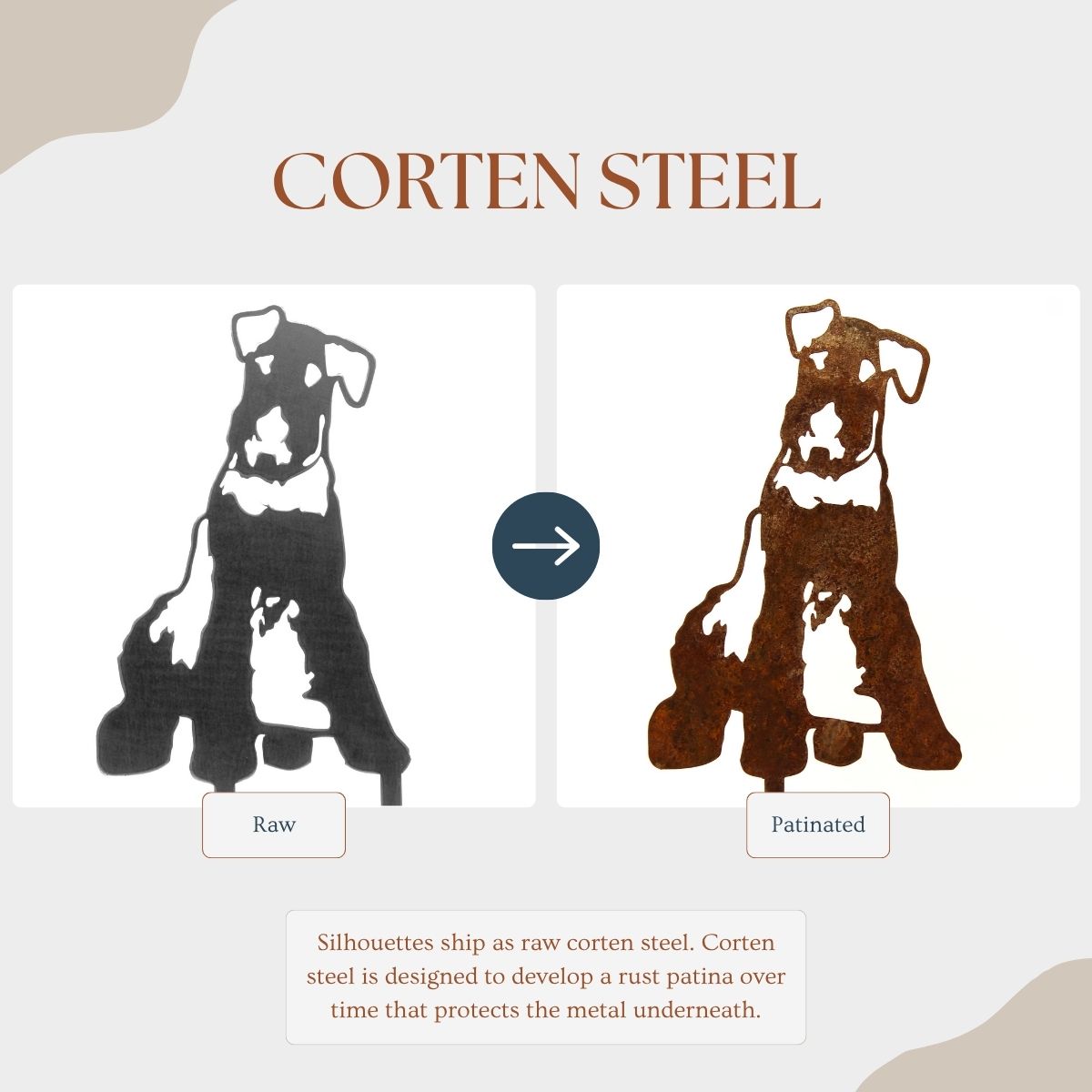 Metal Rescue silhouettes are handmade in the United States from sturdy 11 gauge premium weathering steel, also known as Corten steel. Each design is available in two different finishes- Corten steel and Black.