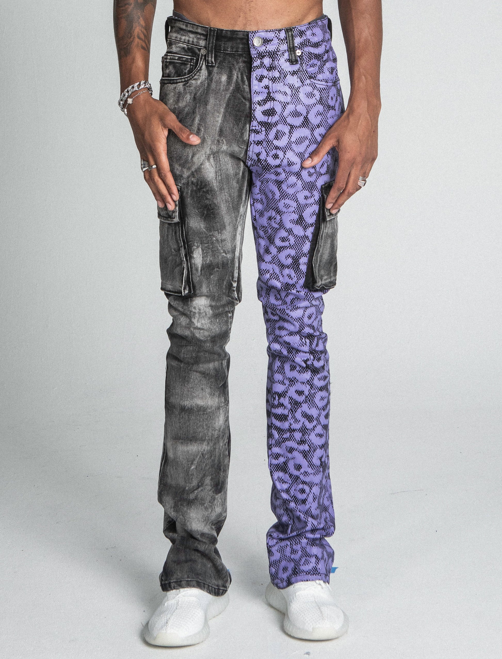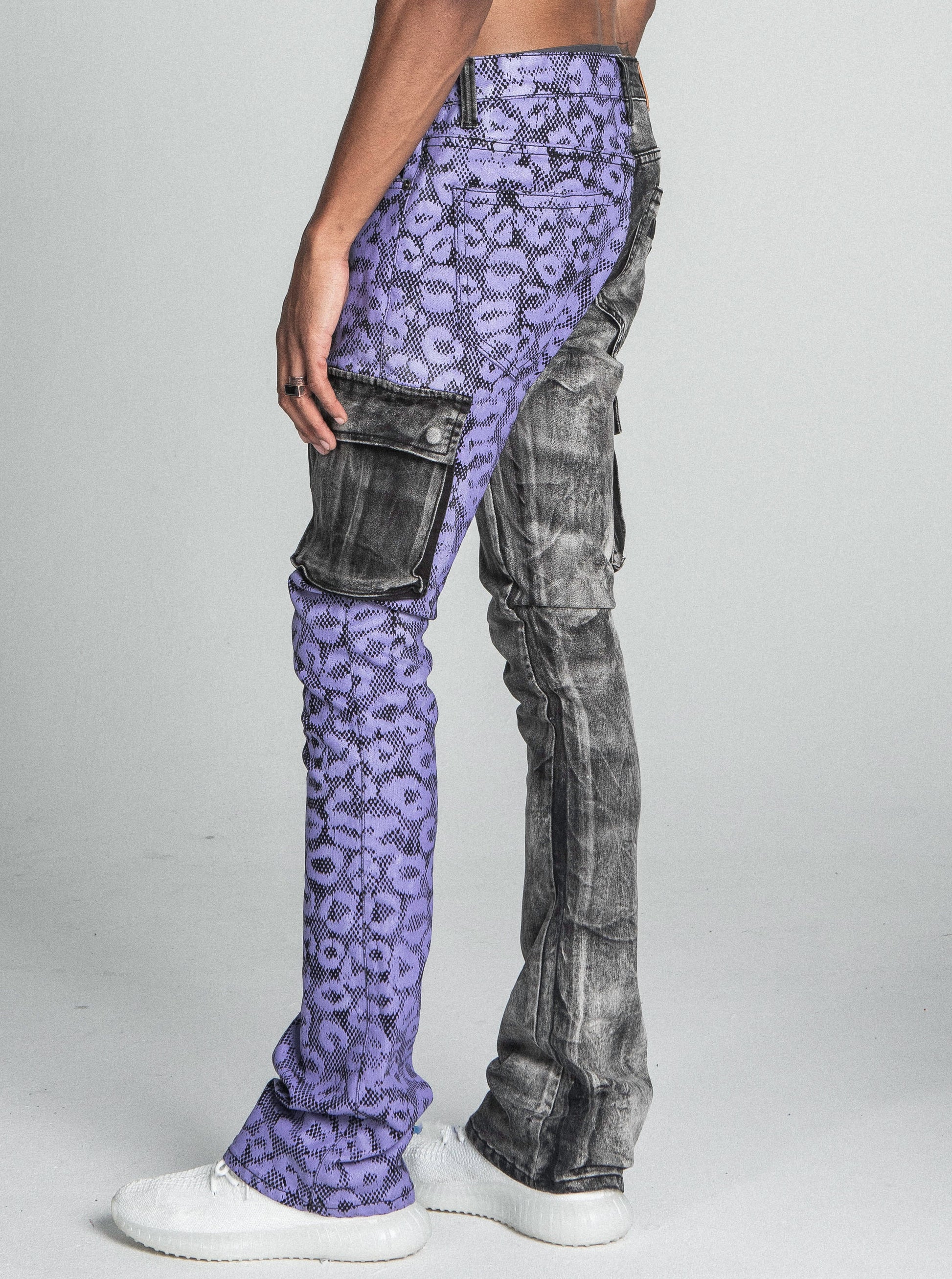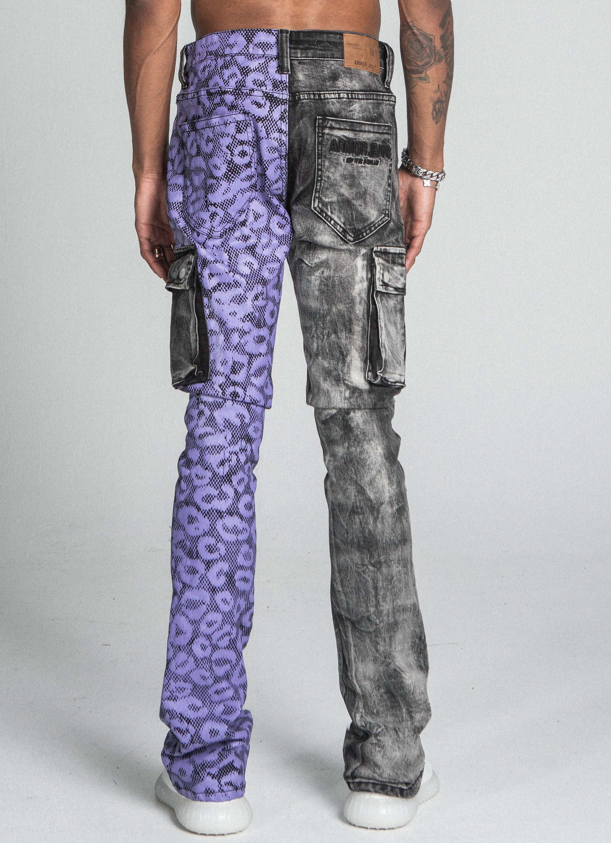 Purple lace screen print with grey wash stacked leg jeans with a five-pocket design, belt loops, and a zipper fly and top button fastening. Made from cotton.