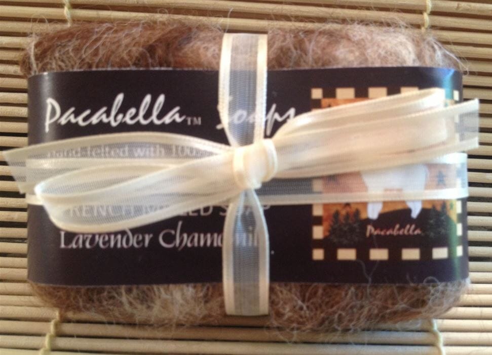If you have never seen this before, it's a "washcloth" made from felted alpaca wrapped around a wonderful bar of soap. With our alpaca felted soaps an "alpaca bath" is a wonderful experience.