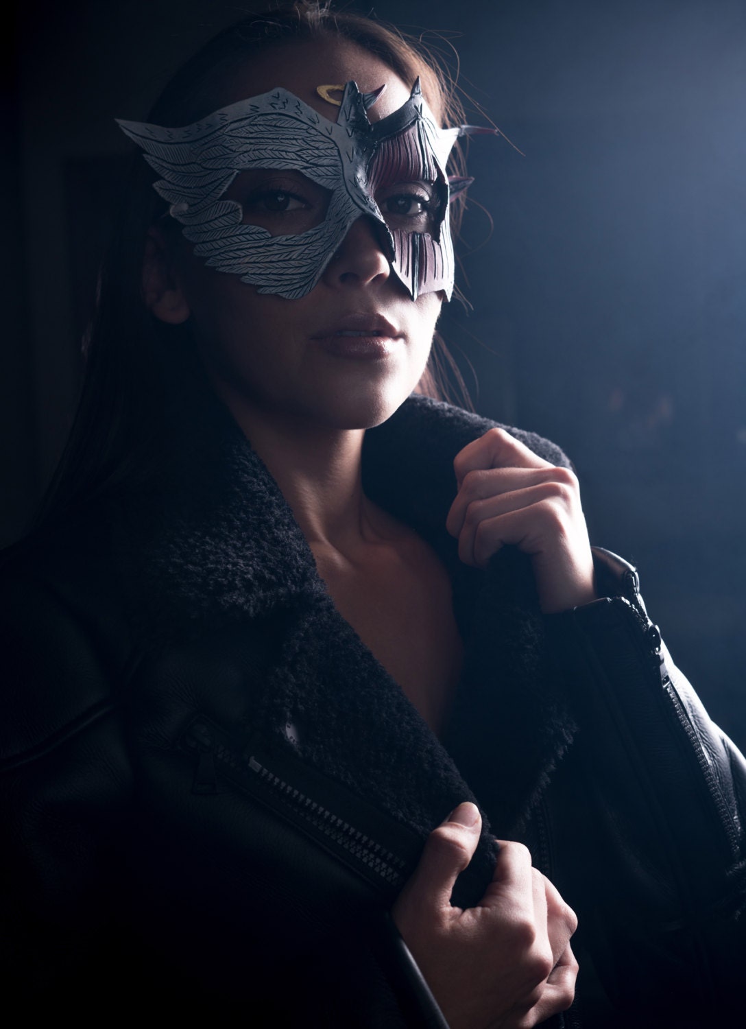 This genuine leather mask has been hand tooled to display the highest details possible, while maintaining aesthetic so that you will feel your best at any event. A take on good vs. evil, this mask has been hand painted for a superior finish.