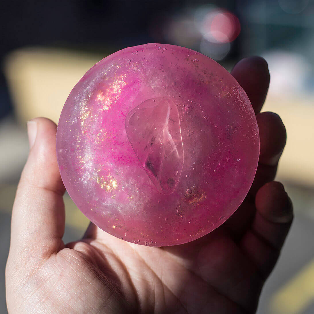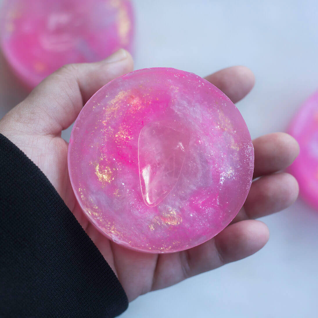 Ingredients: Sorbitol, Propylene Glycol, Sodium Laureth Sulfate, Stearic Acid, Water, Sodium Hydroxide, Myristic Acid, Sodium Cocoyl Isethionate, Glycerin, Lauric Acid, Rose Kaolin Clay, White Mica, Pink Oxide, Silver Mica, Blue Pigment, Biodegradable Glitter, Rose fragrance, Lavender eo, Ylang Ylang eo