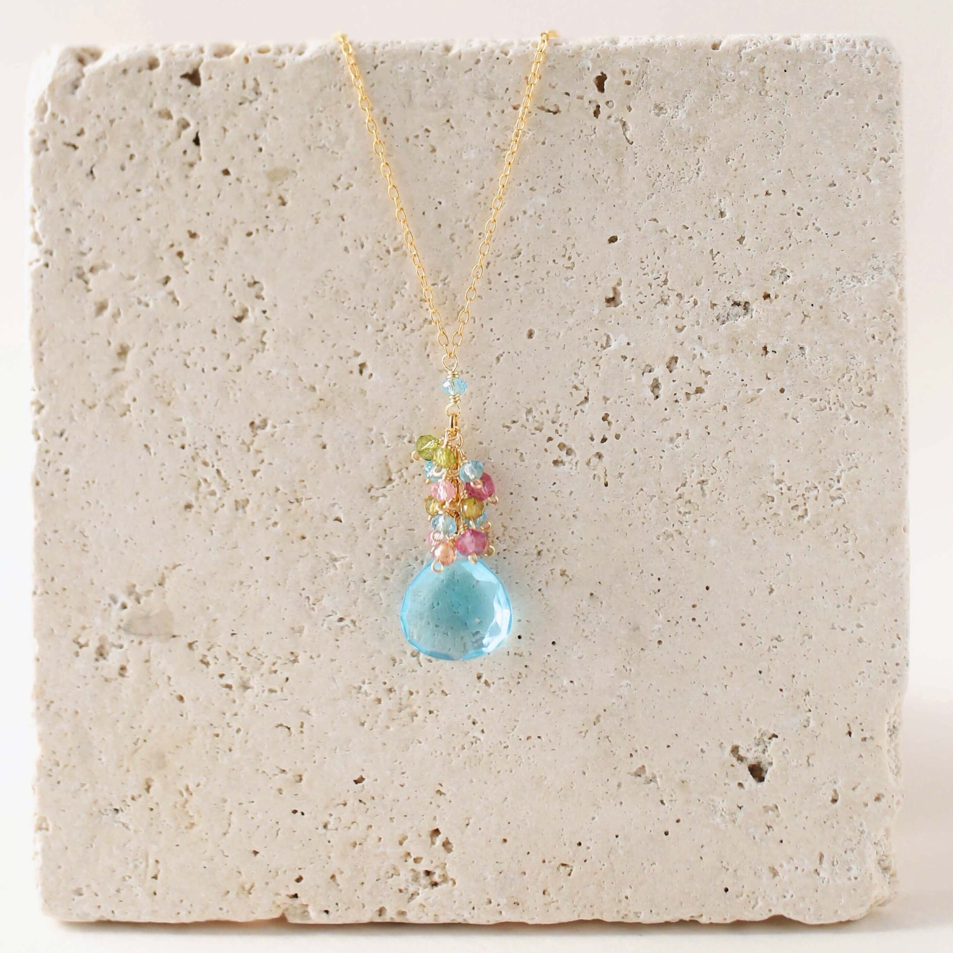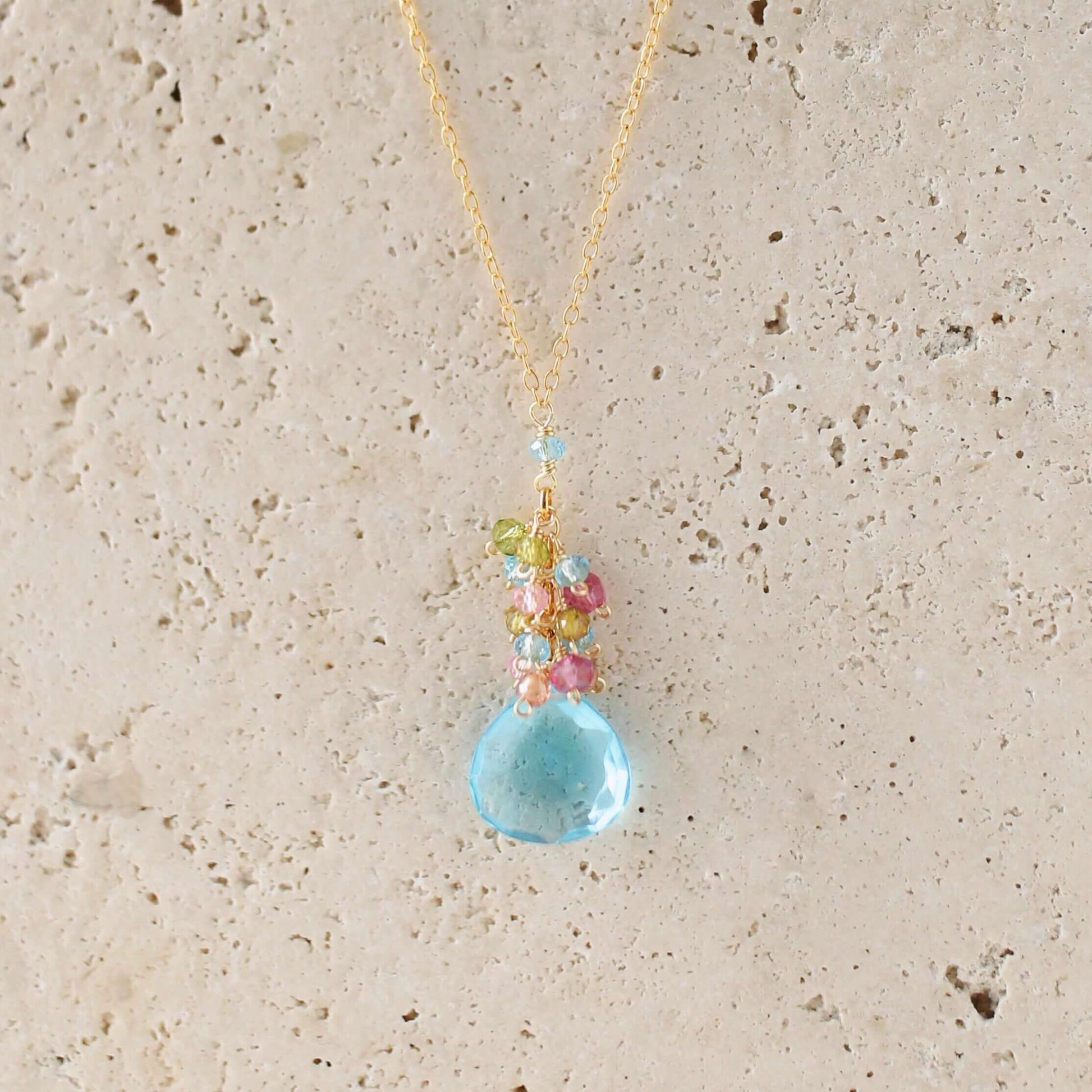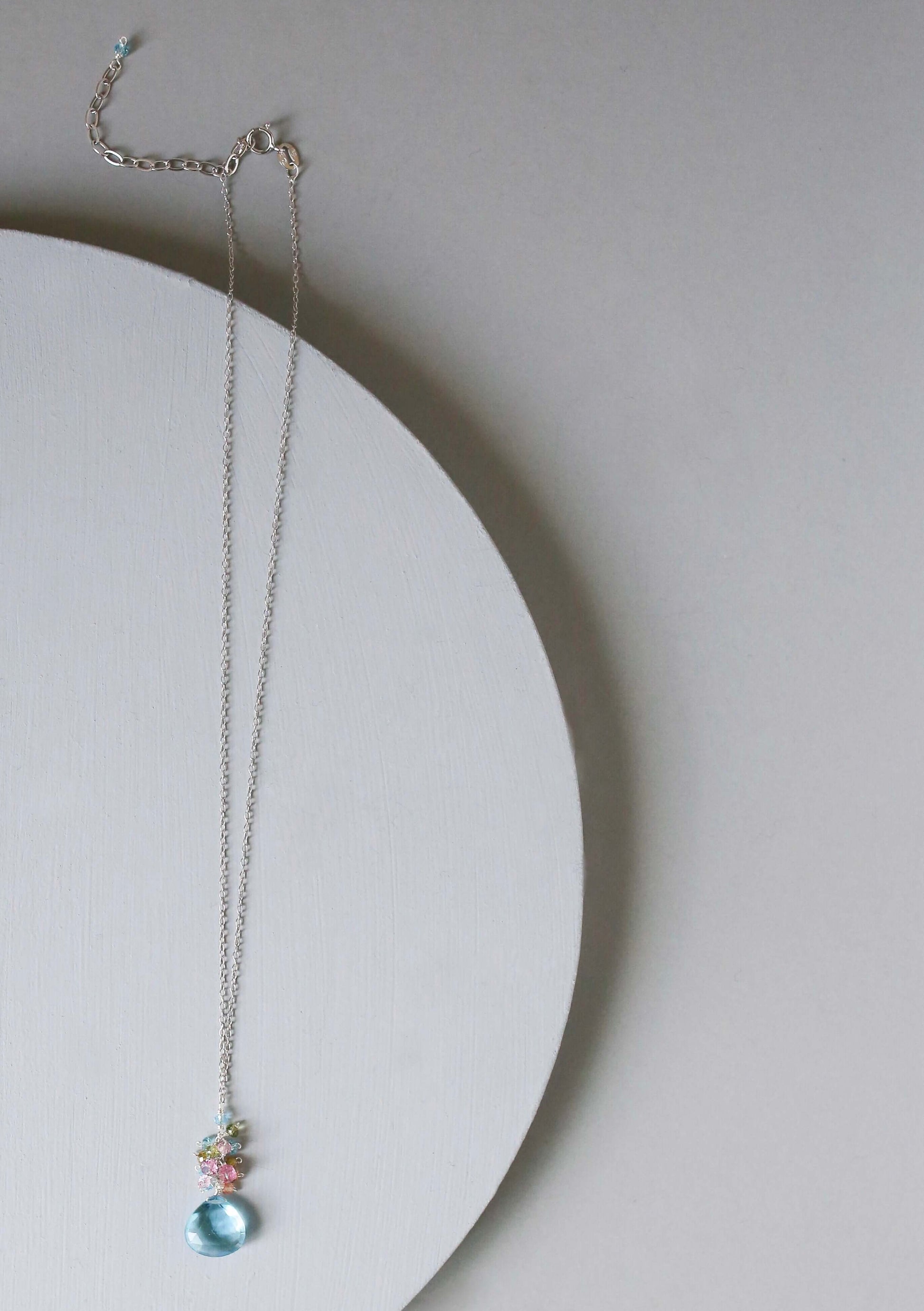 Our floating aqua blue quartz gemstone "raindrop" pendants are absolute neck candy.