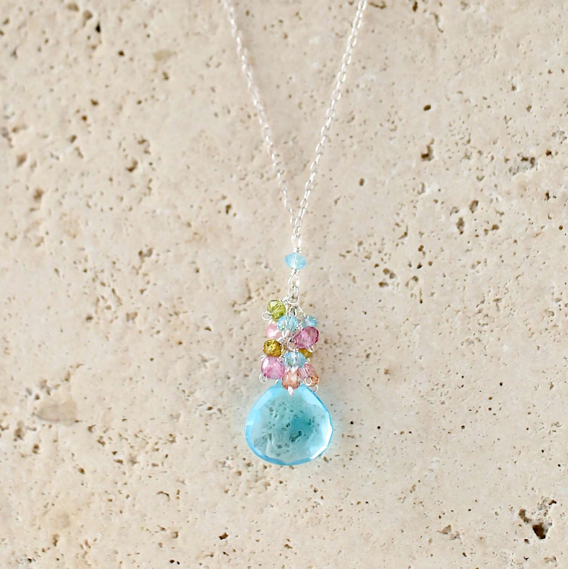 Aquamarine Quartz Silver Raindrop Cluster Necklace