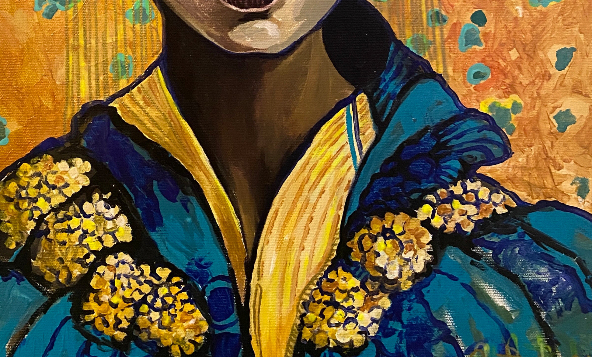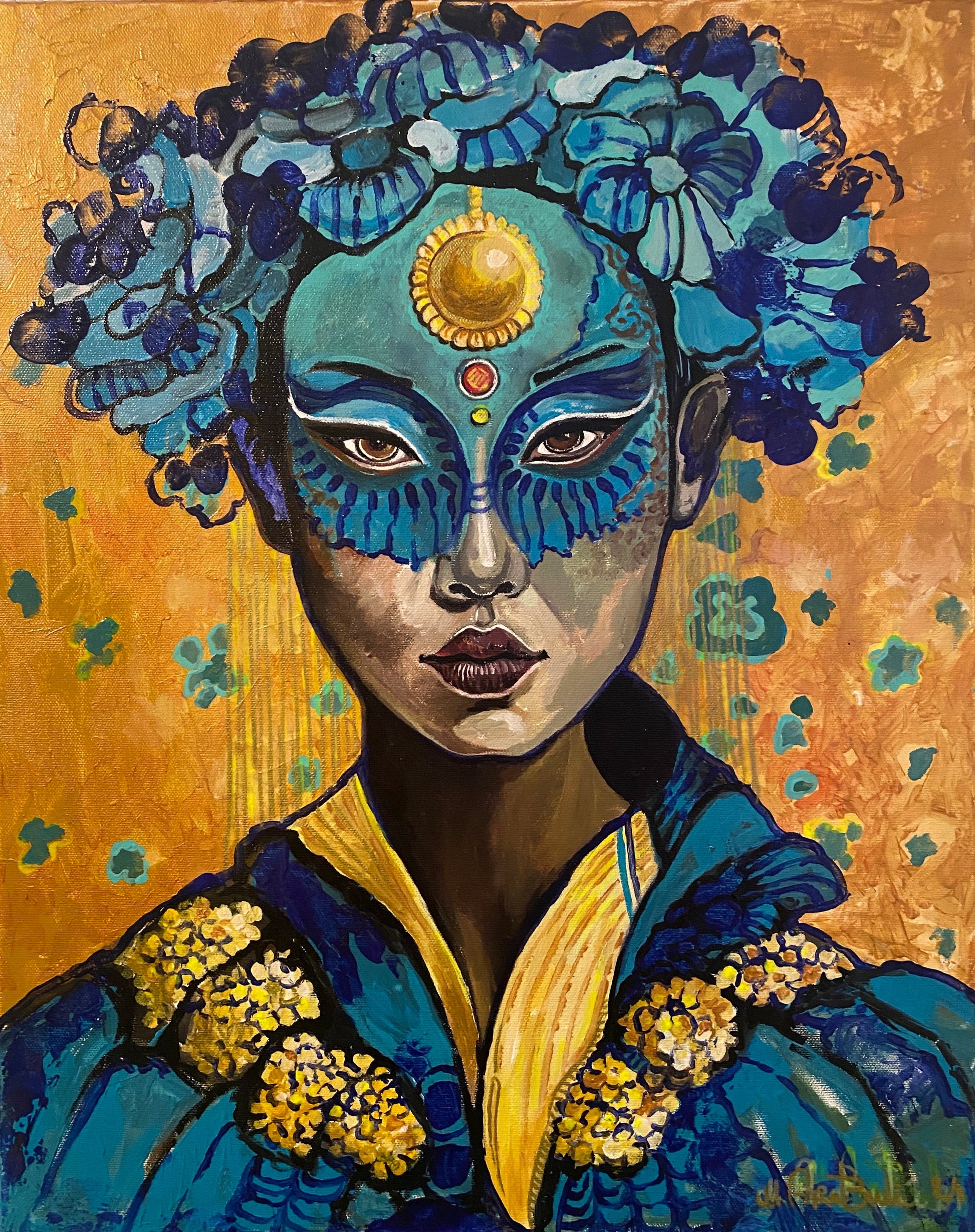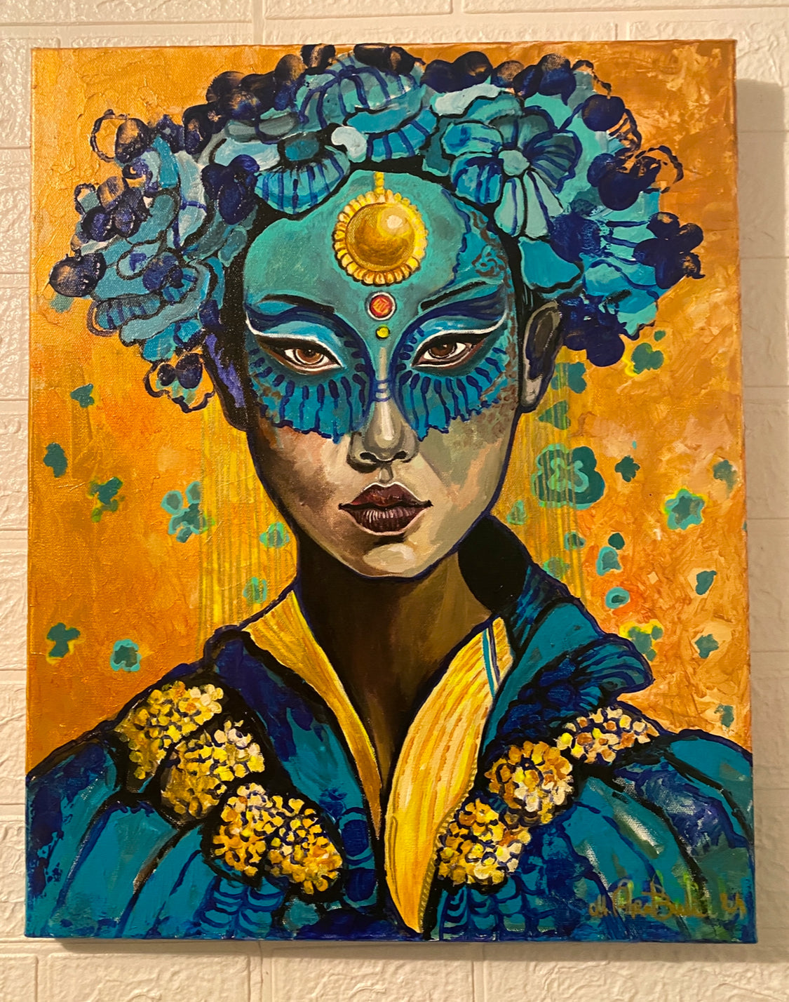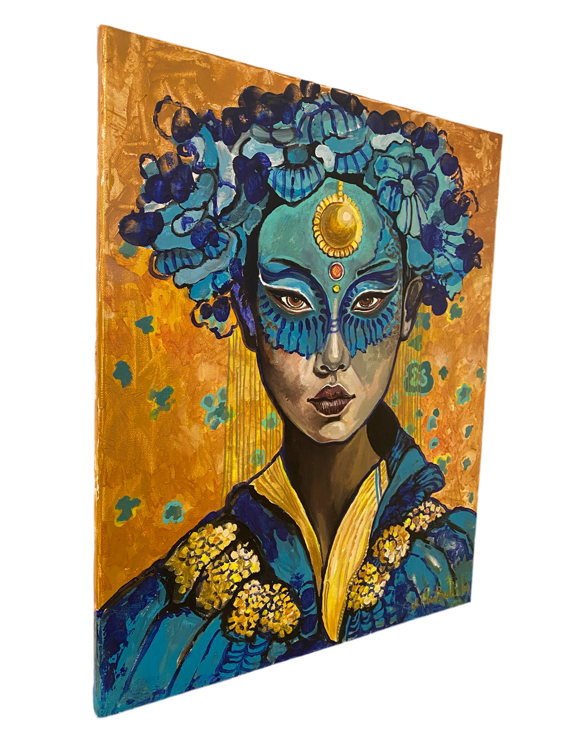 The Asian Beauty (Celestial Mask )is an original acrylic painting by Georgian artist Maia Arabuli. This striking portrait blends fantasy and symbolism, featuring a mysterious woman adorned with a radiant headpiece and a bold, blue mask that accentuates her intense gaze. Surrounded by an explosion of florals and deep gold textures, the figure embodies power, elegance, and mysticism.