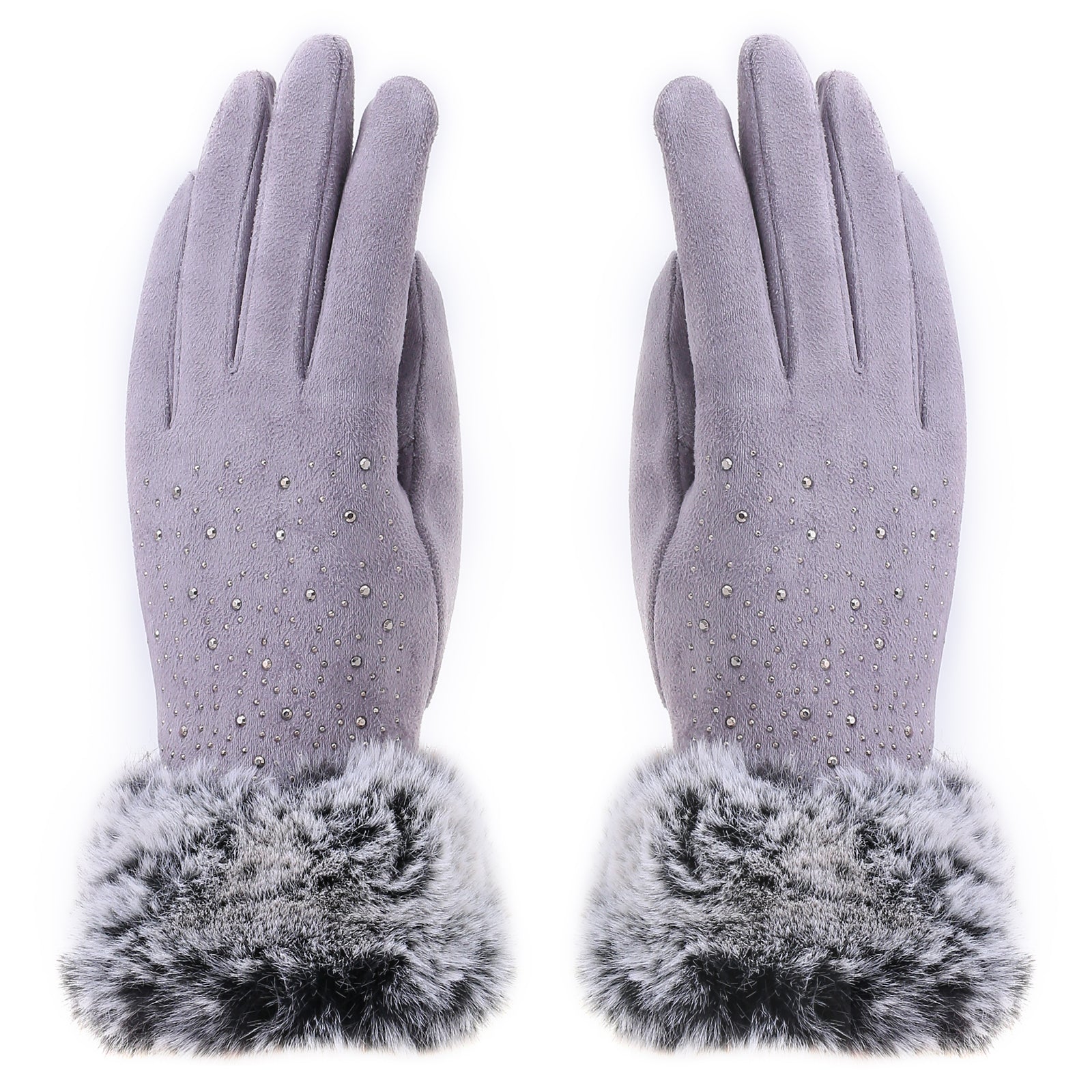 Audrey Faux Fur Gloves in Grey with Grey Crystals