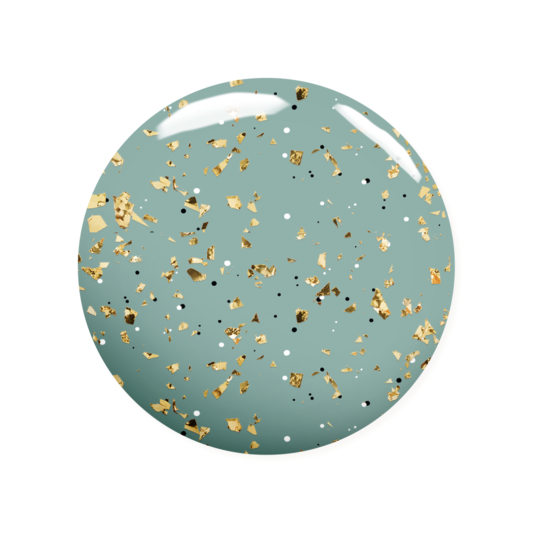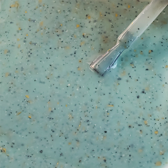 Milky formula with tiny white & black flecks. It also has a hint of gold leaf.