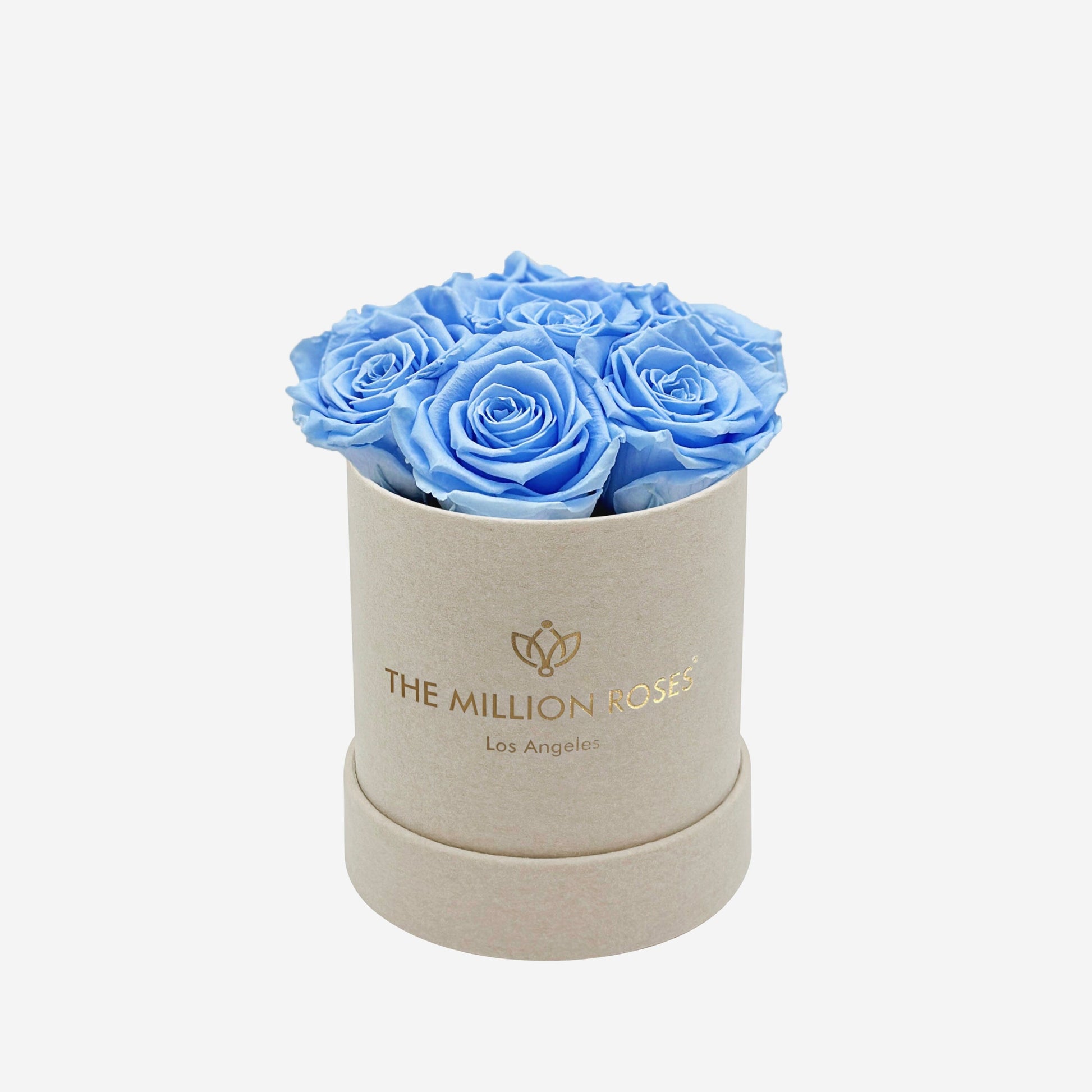 The hand-crafted beige suede box in our signature Basic arrangement showcases red and gold preserved roses.