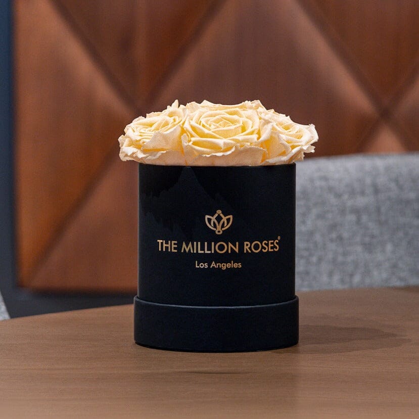 The hand-crafted black box in our signature Basic arrangement showcases ivory preserved roses.