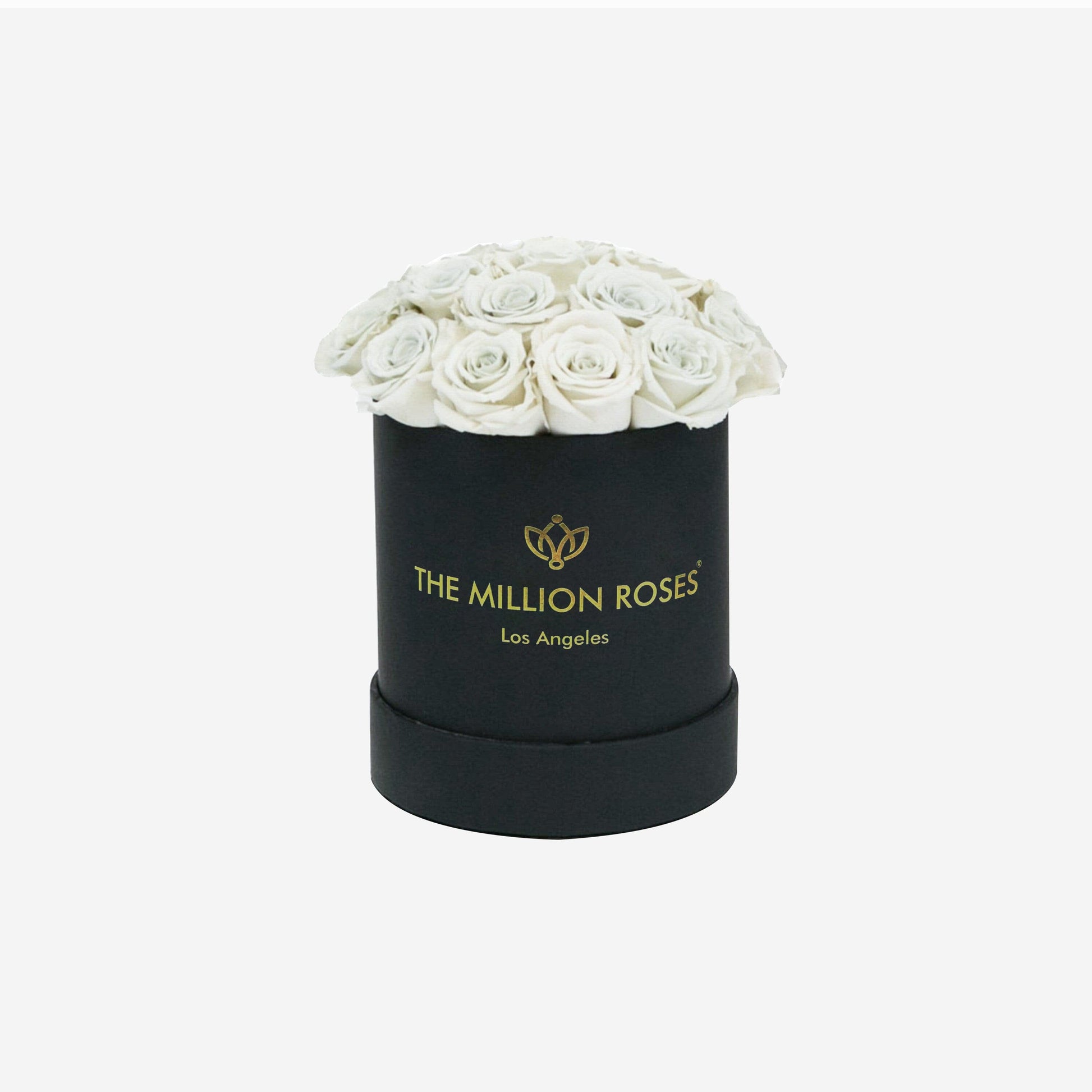 The hand-crafted black box in our signature Basic arrangement showcases white preserved roses.