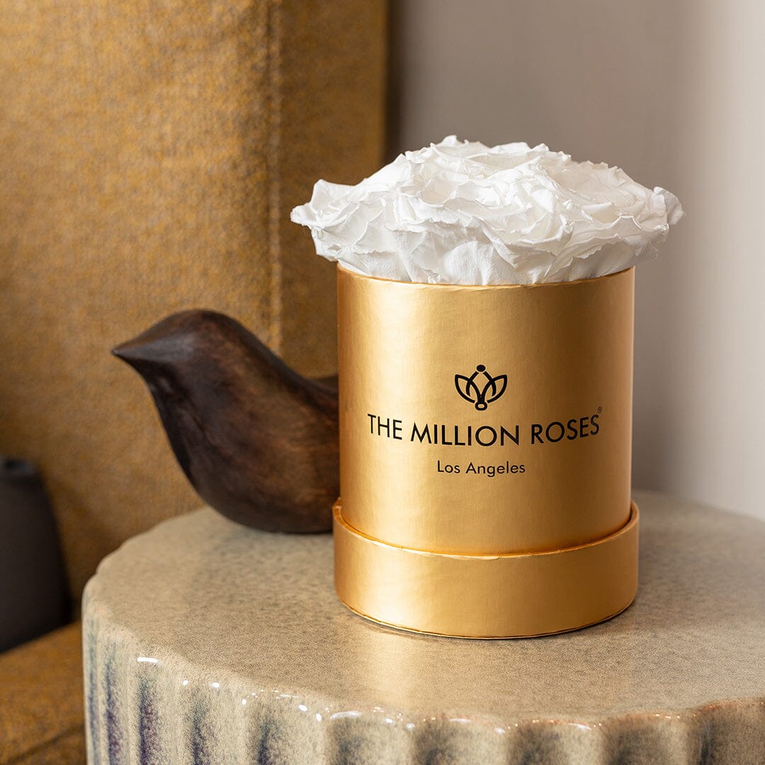 The hand-crafted gold box in our signature Basic arrangement showcases white preserved roses.