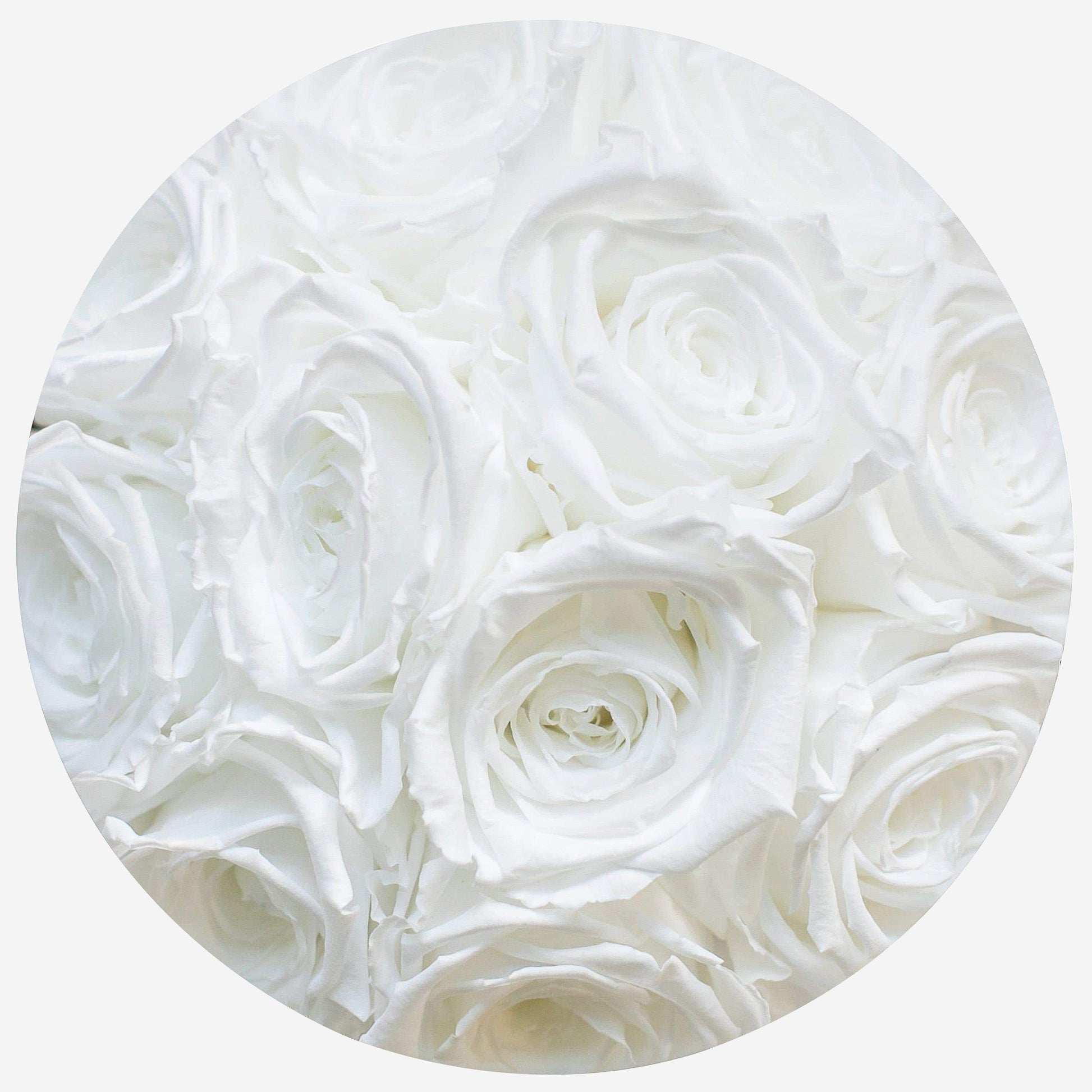 The hand-crafted royal blue box in our signature Basic arrangement showcases white preserved roses.
