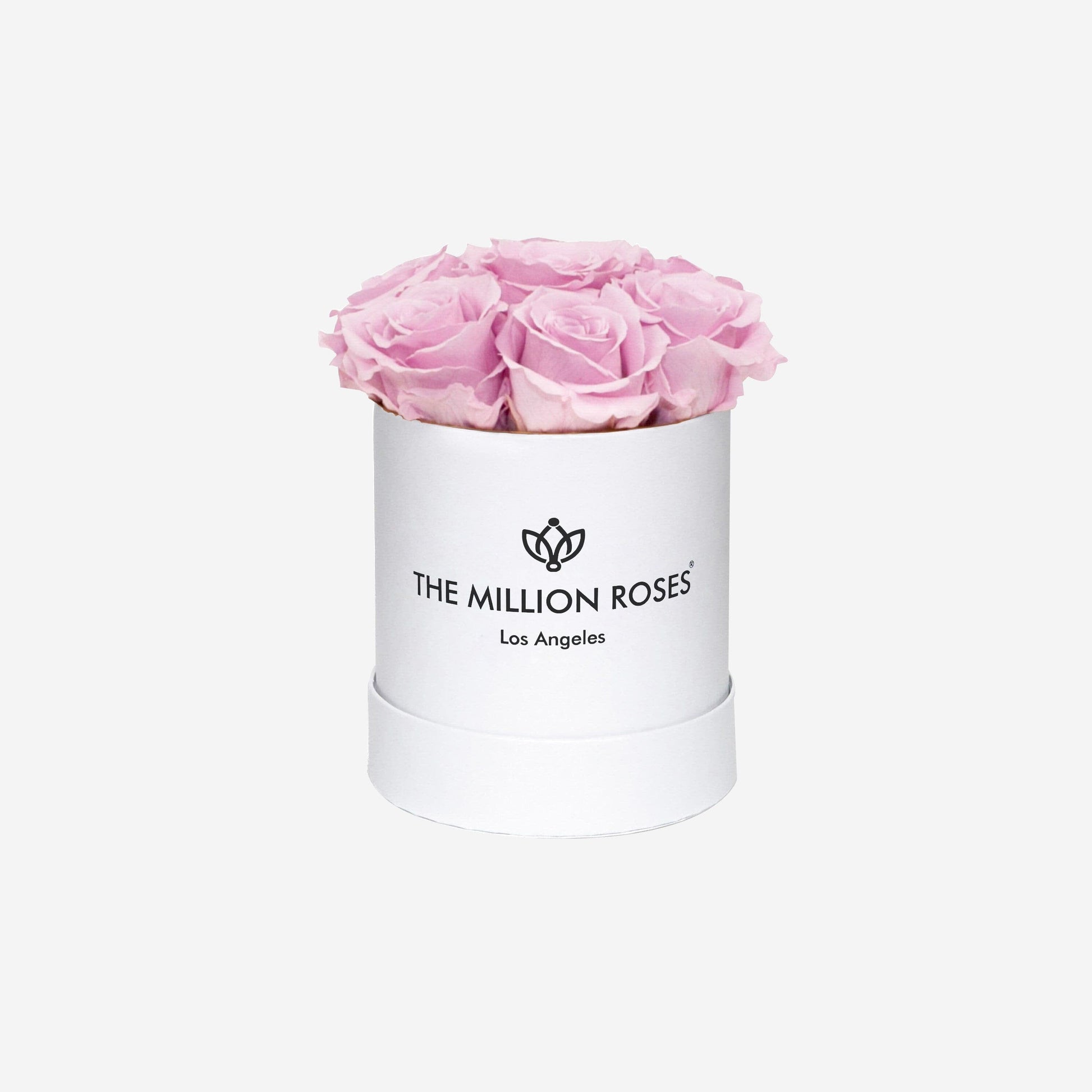 The hand-crafted white box in our signature Basic arrangement showcases light pink preserved roses.