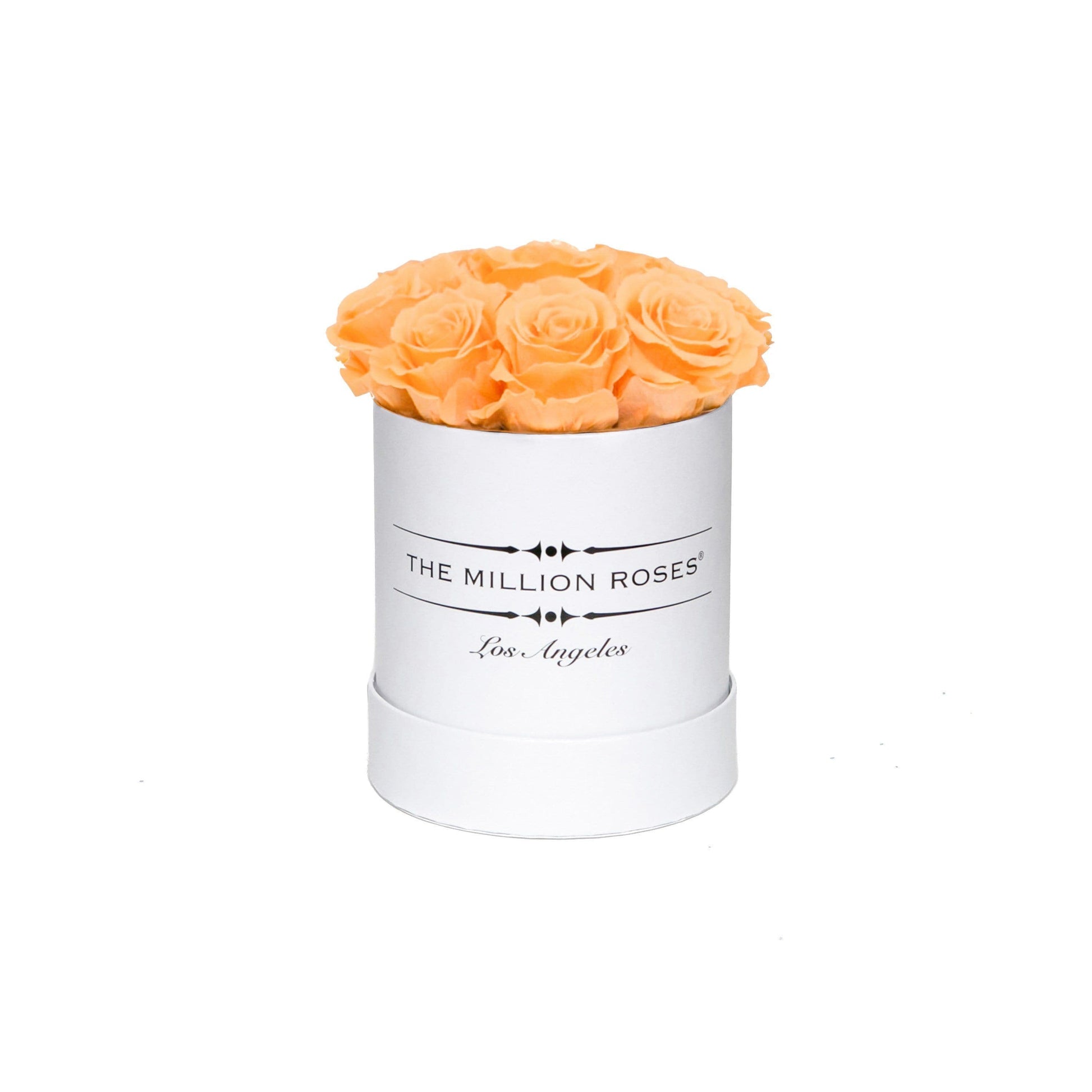 The hand-crafted white box in our signature Basic arrangement showcases peach preserved roses.