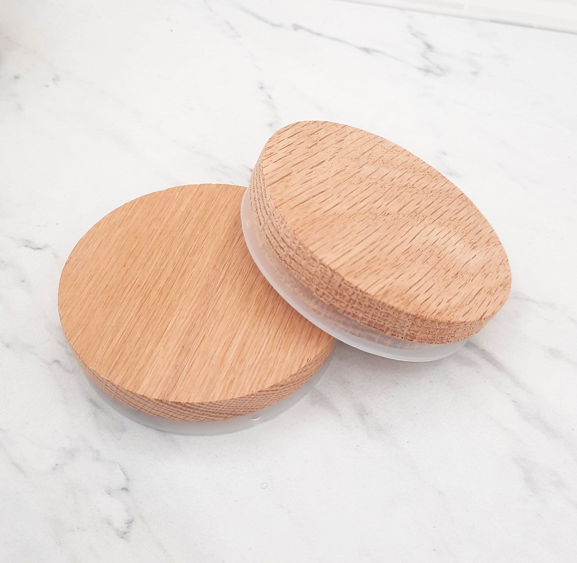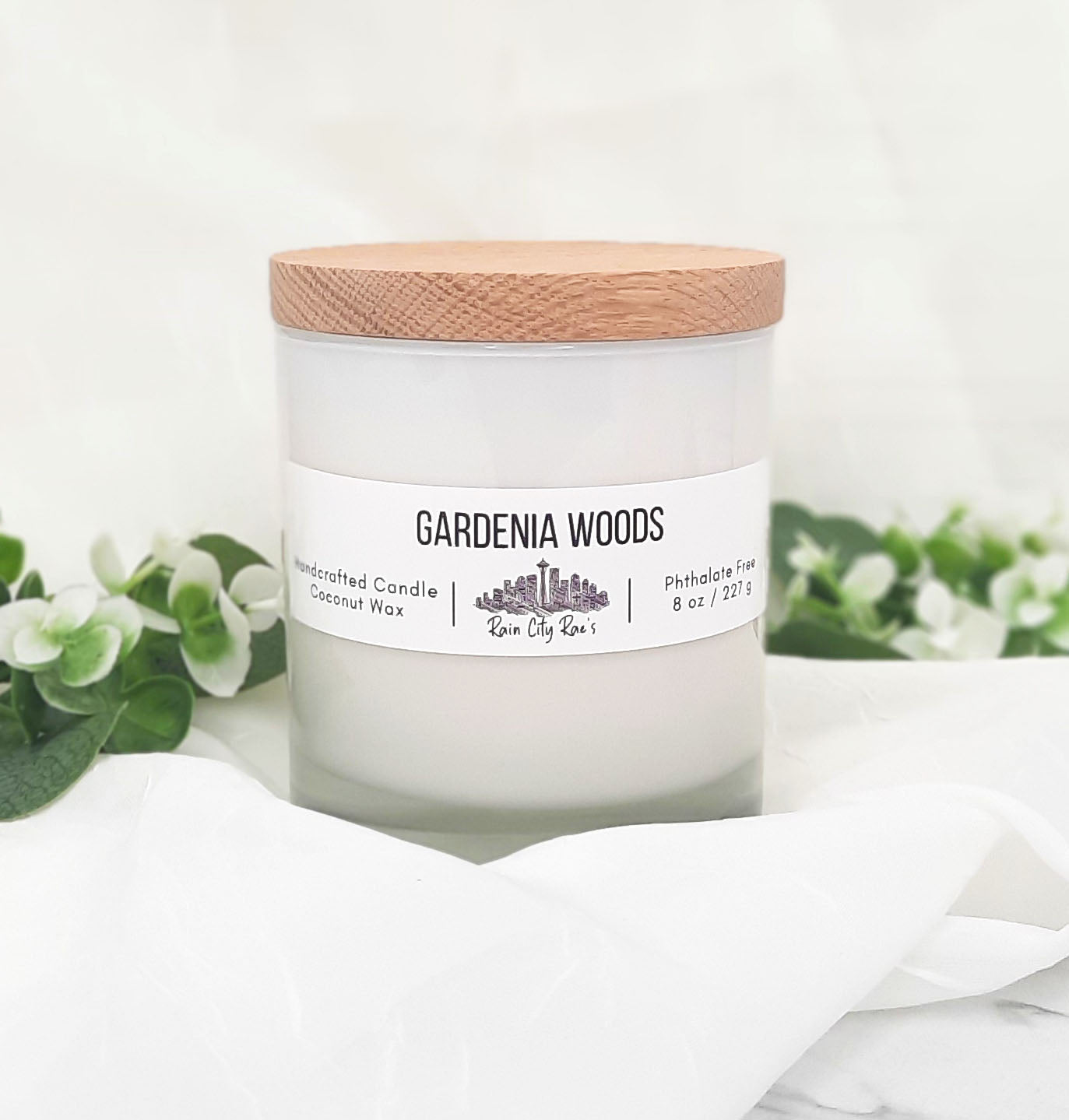 Signature candle in a modern white glass container with reusable natural wood lid.  Minimalist decor matches any style, gender, or room.