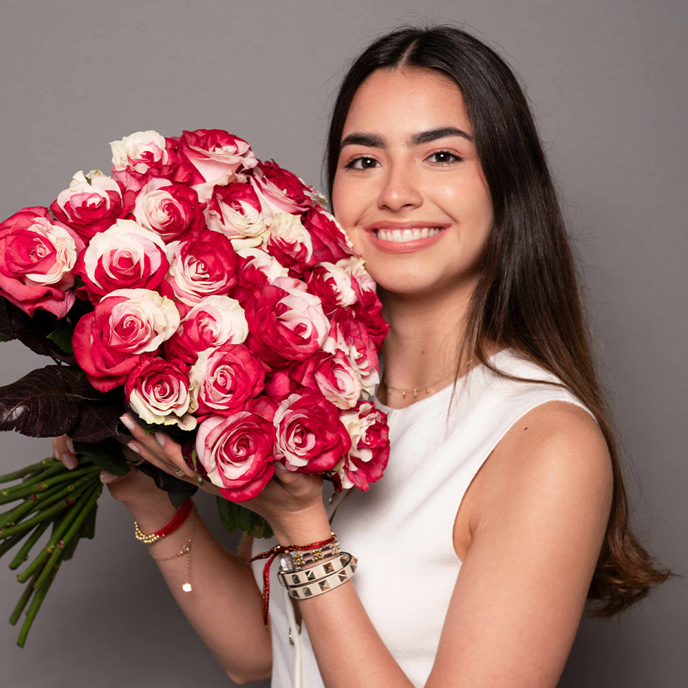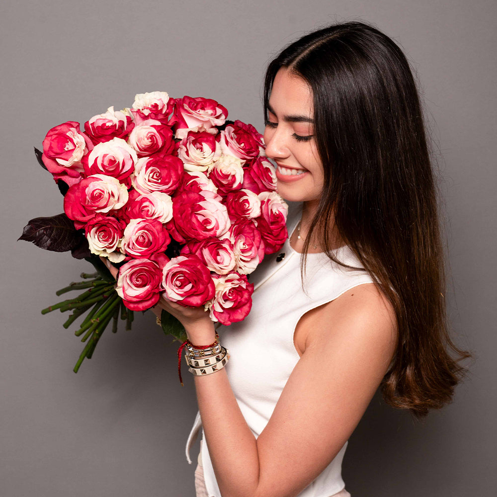 We present "Bloody Margarita" - a new bouquet that turns the idea of classic rose arrangements upside down. This Bloody Margarita bouquet is created for those who appreciate brightness and individuality in every detail. It harmoniously intertwines shades from soft white to rich red, creating a stunning gradient reminiscent of a summer's sunset.