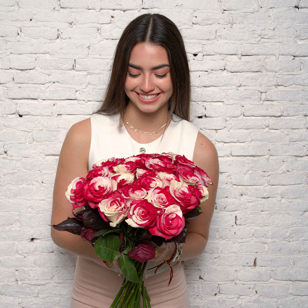 Our vibrant gift bouquet is not just a flower arrangement. It is a real work of art, where each rose is selected with special care. The contrasting combination of light and bright shades creates a dynamic play of colors that will captivate everyone. The bouquet features a classic round design, making it a universal gift for any event - from a romantic date to a formal occasion.