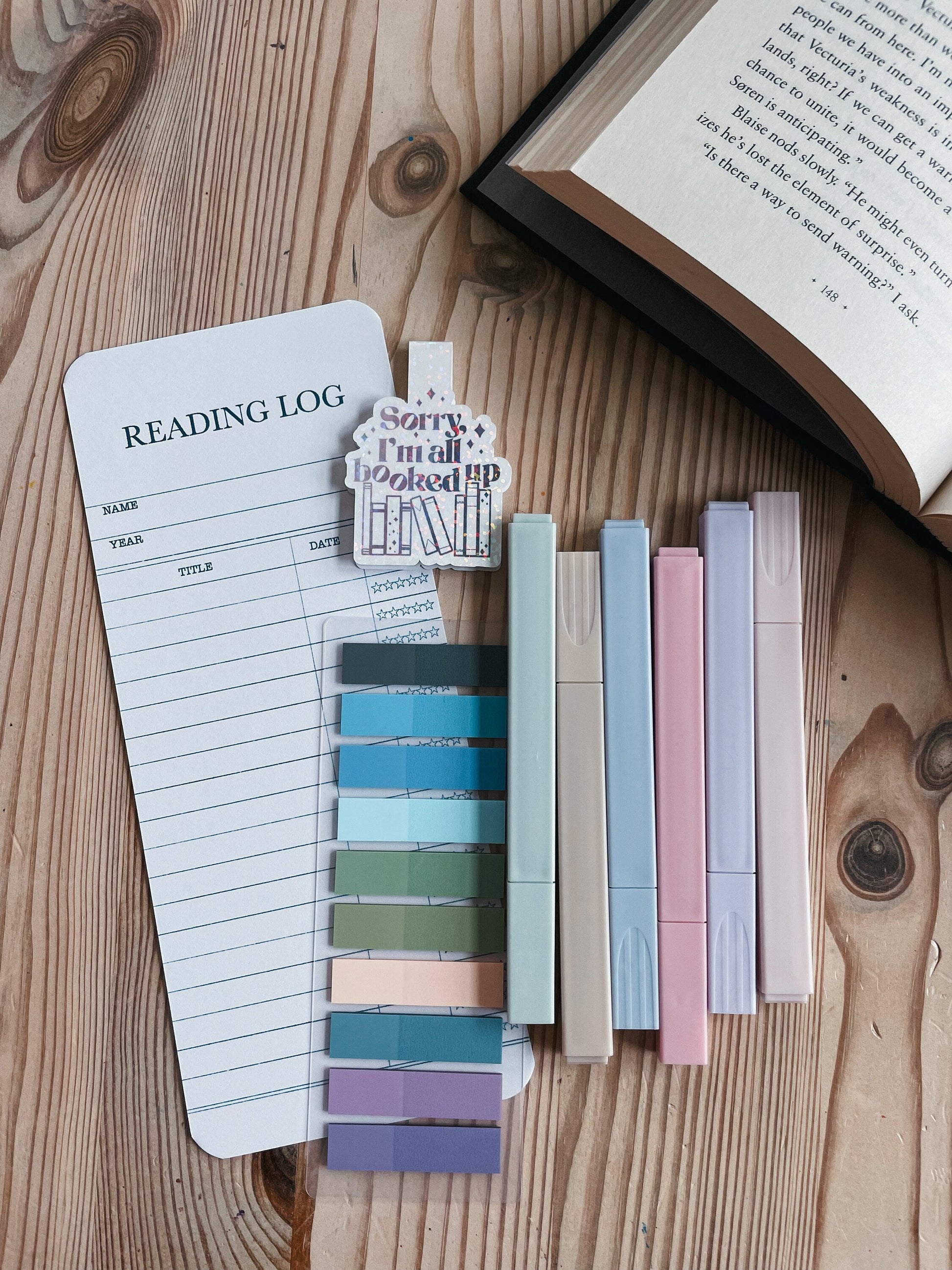 Book Annotating kit- bookmark reading log, annotating tabs, highlighters & a magnetic bookmark | Everything but the Book | Book Lovers kit