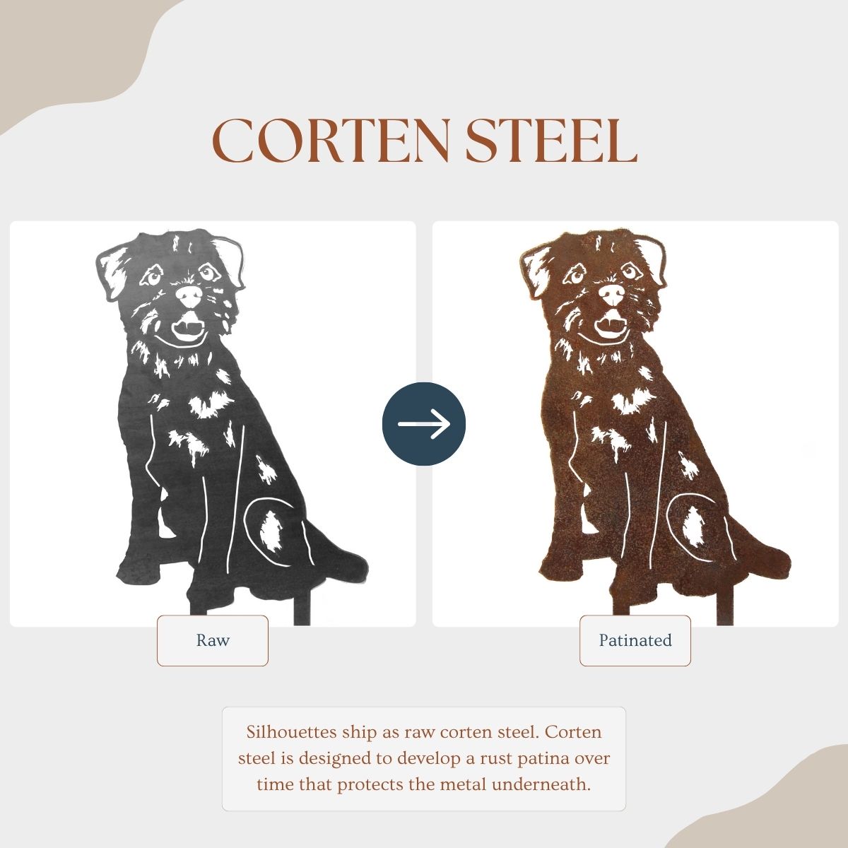 Metal Rescue silhouettes are handmade in the United States from sturdy 11 gauge premium weathering steel, also known as Corten steel. Each design is available in two different finishes- Corten steel and Black.