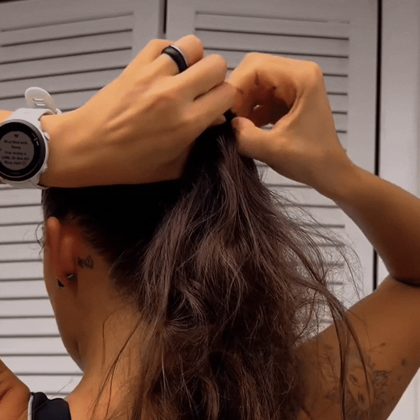 2. Optional: Unbuckle to adjust and tighten the Buckle Hair Tie if you need one more loop around