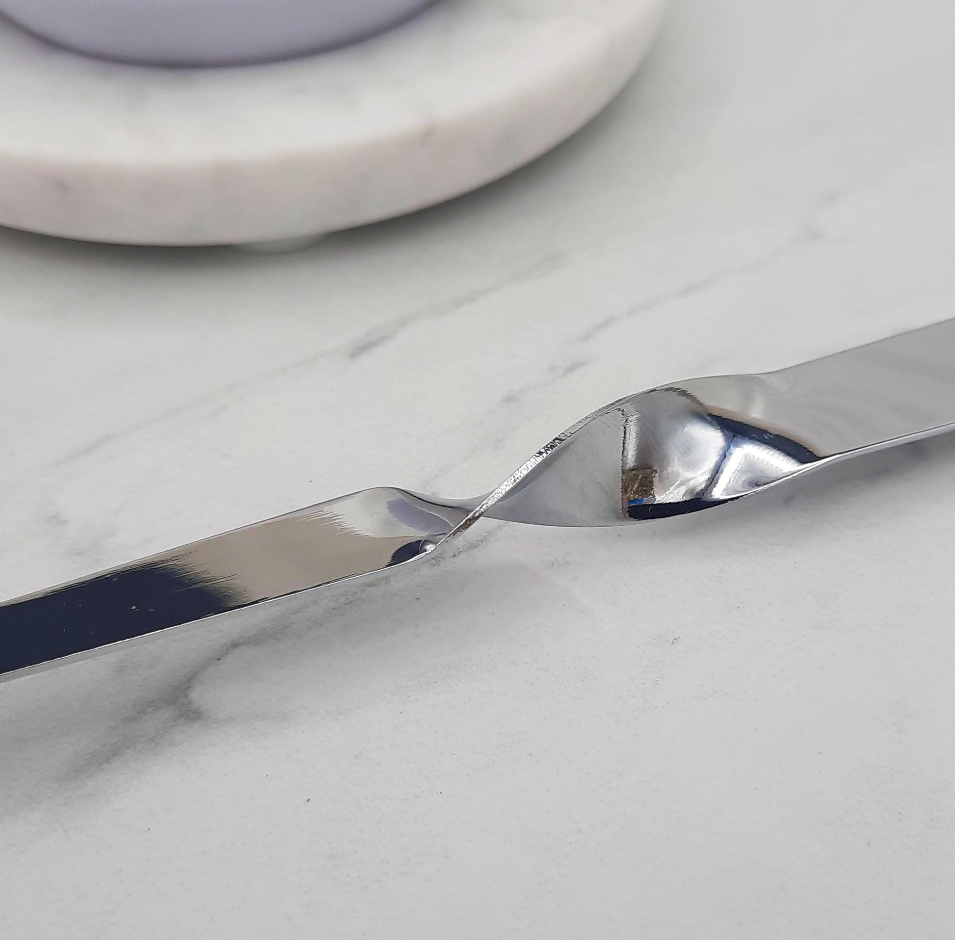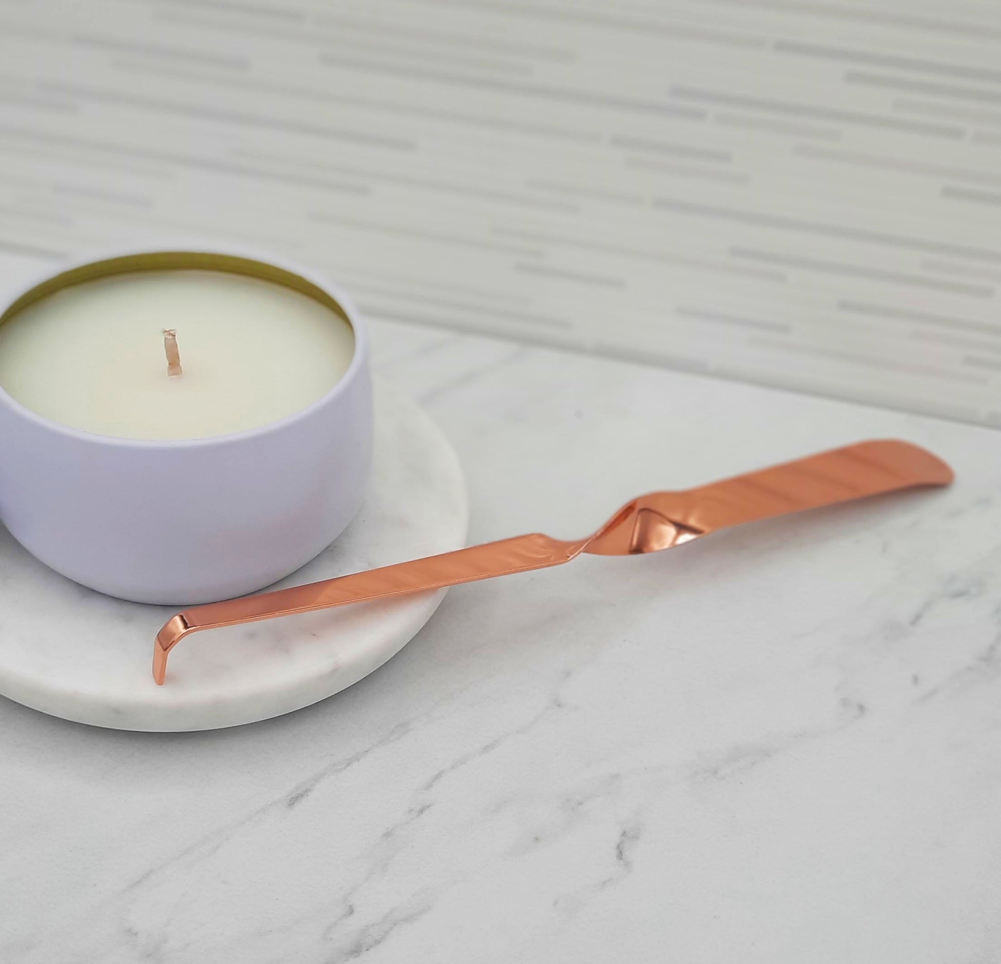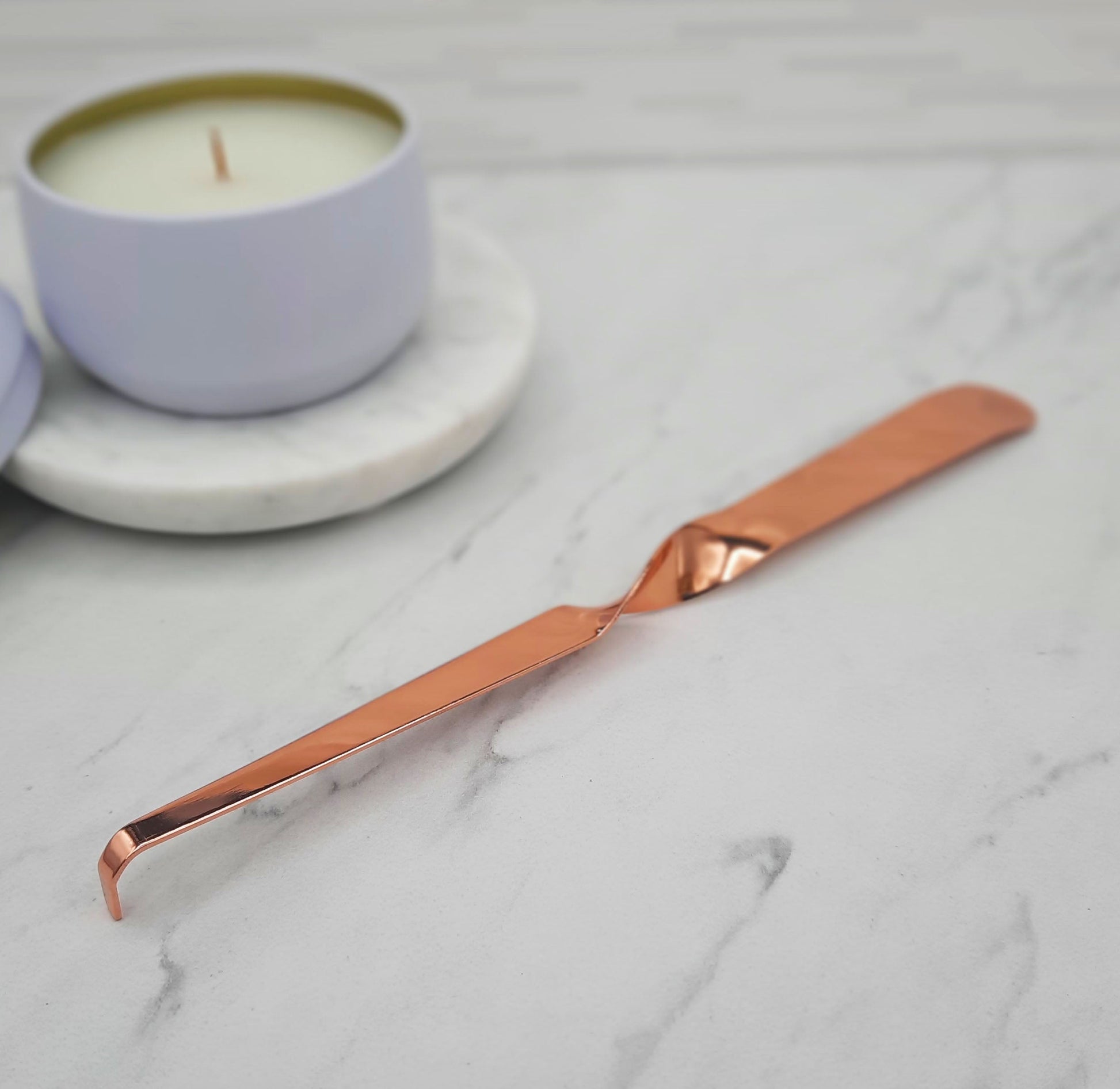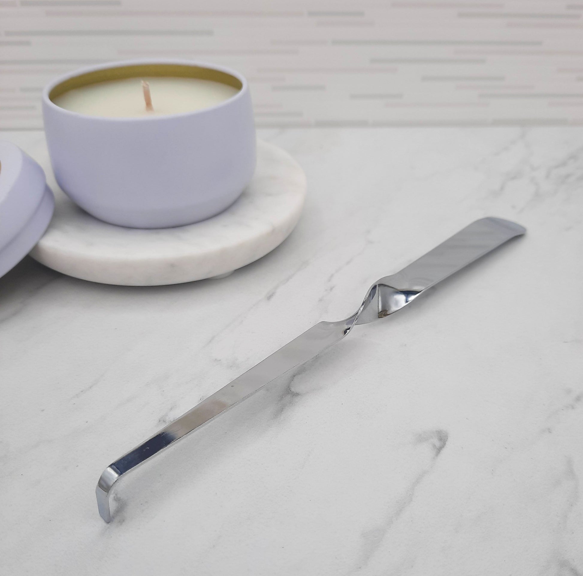 An elegant metal tool with a sophisticated, twist and curved end.  Use the wick dipper to push the wick in to the wax pool and re-straighten/re-center the wick to ensure a smokeless experience. Your wick will be perfectly primed for the next time you light it.