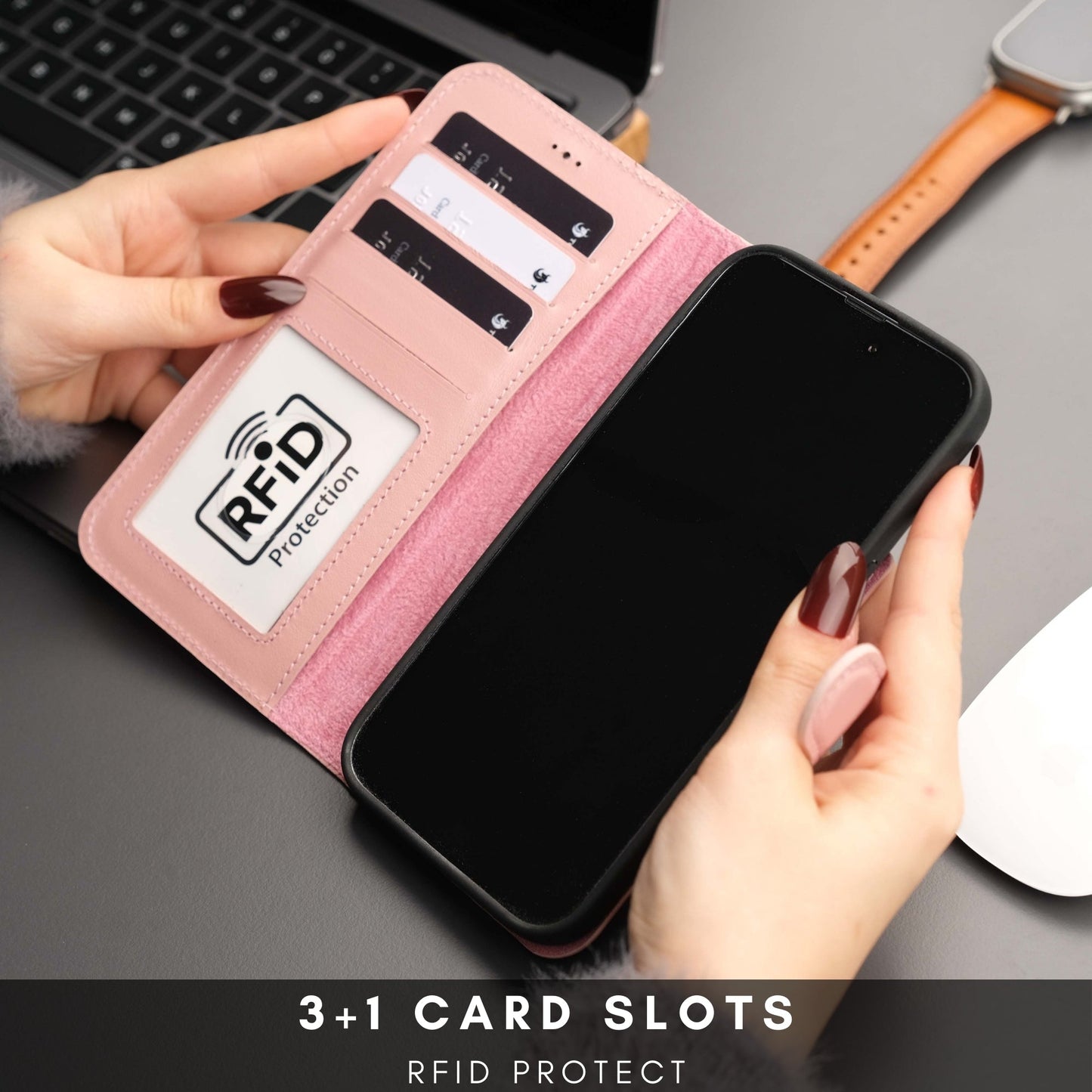 The stylish and protective Casper leather wallet phone case from TORONATA keeps your iPhone 16 Plus safe. Elegant and helpful, this full-grain leather case is a great addition to any collection. Your cards are safe because there are four card slots, one of which is an obvious ID slot, and RFID blocking technology.