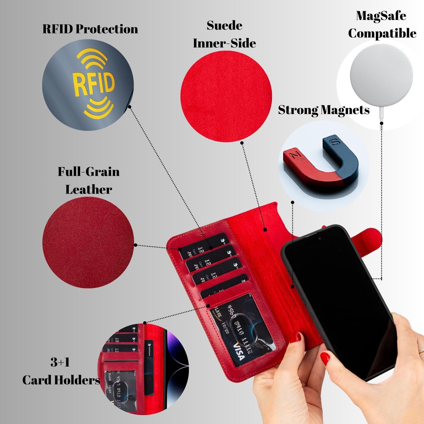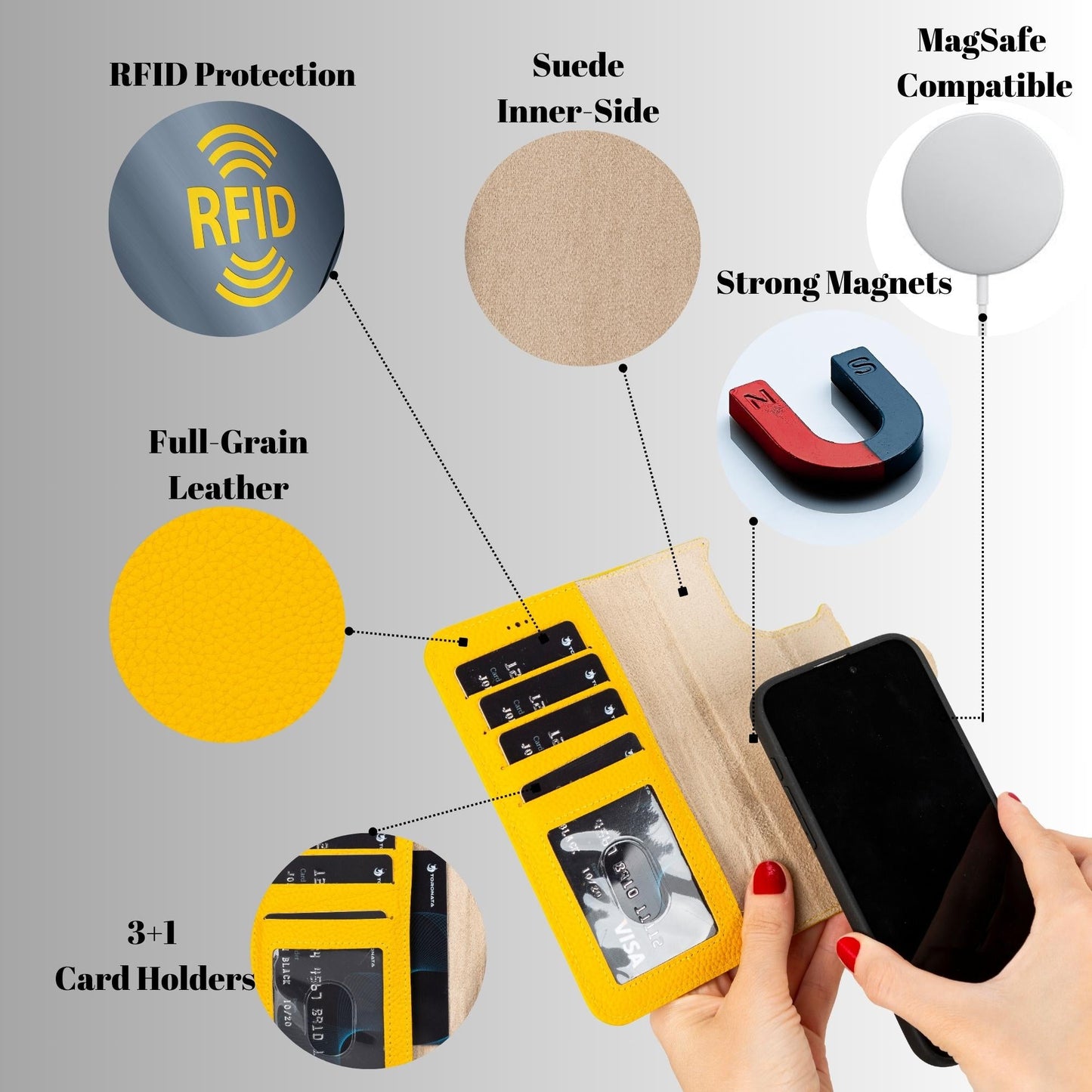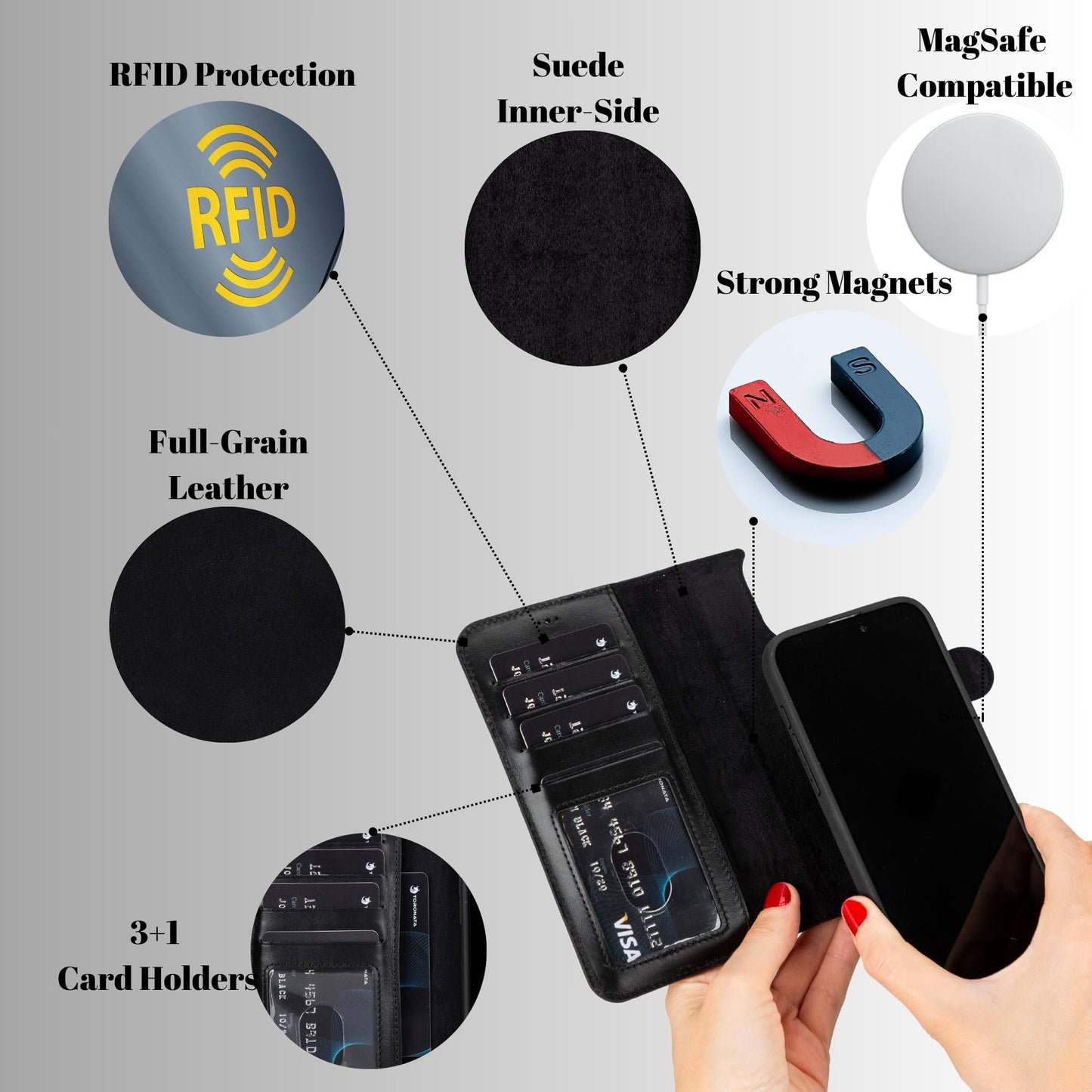 Experience the ultimate in protection and style with the Casper Wallet. Handmade from genuine leather and designed with four credit card slots and a cash compartment, its MagSafe and wireless charging-compatible back cover and strong magnets keep your iPhone 15 Pro Max, iPhone 15 Pro, iPhone 1Plus, and iPhone 15 secure. RFID protection guards against card skimming, while the transparent window and pushable structure give easy access to an ID. Plus, its kickstand feature makes watching videos a breeze. Get the Toronata Casper Wallet today!