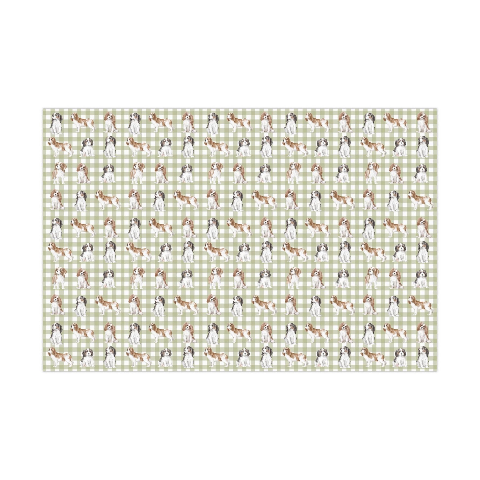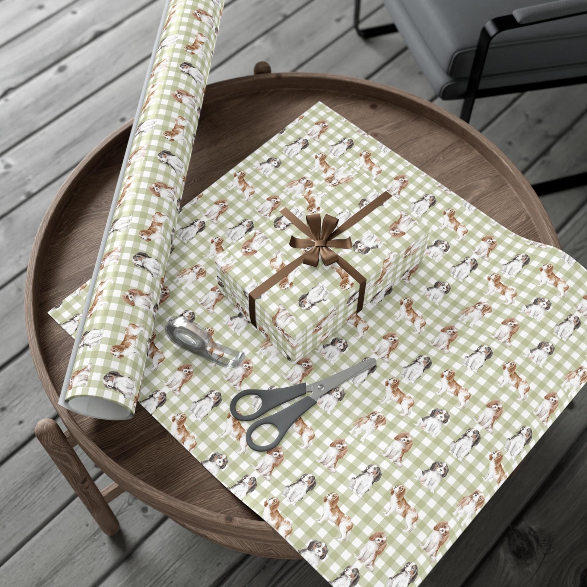 Wrap your gifts in style with this charming green gingham wrapping paper featuring an adorable Cavalier King Charles Spaniel. Perfect for dog lovers, this unique wrapping paper adds a playful and personal touch to holiday gifts, birthdays, or any special occasion. Elevate your gift-giving with this delightful dog-themed design.