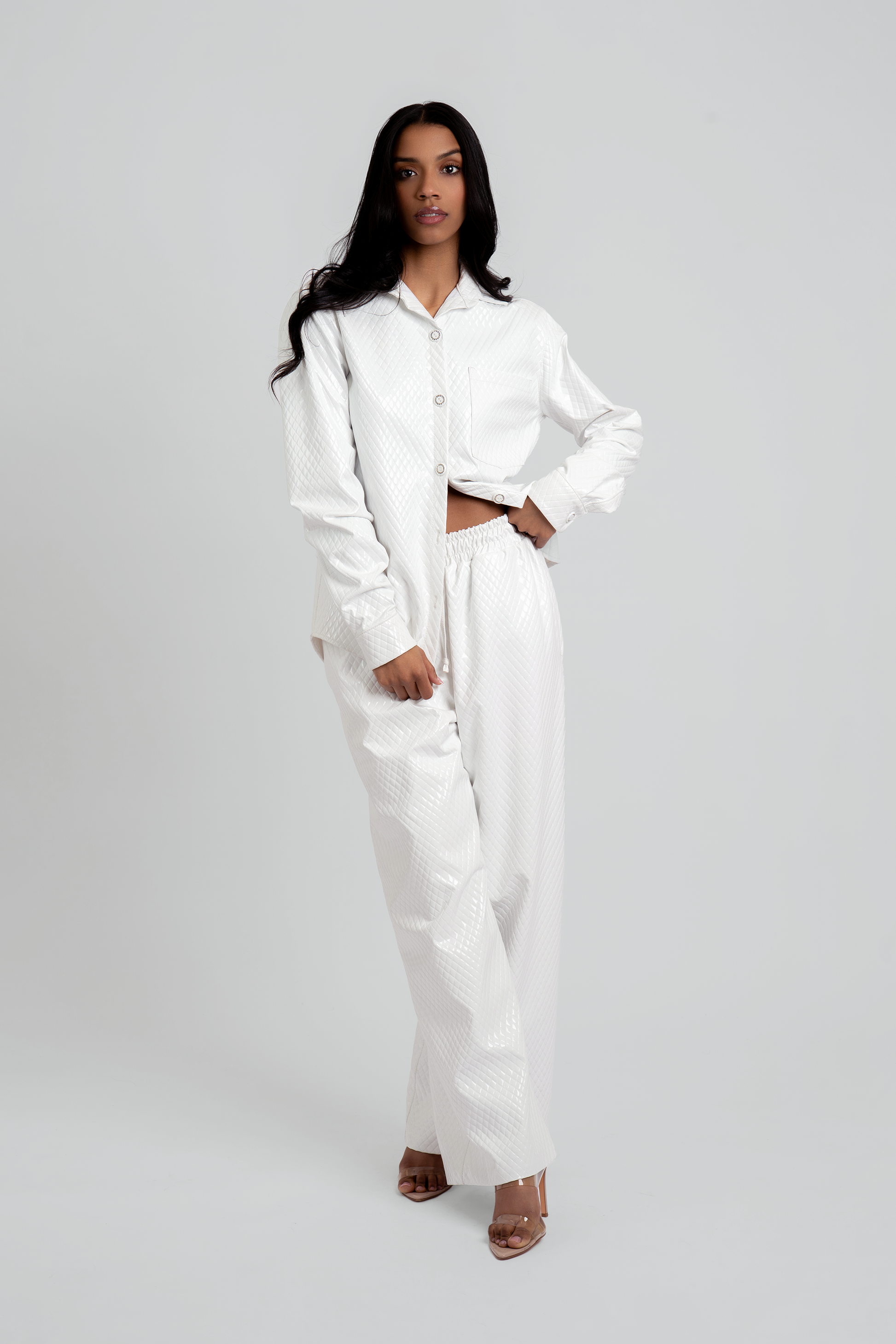 The Celeste pants are crafted from red or white quilted vegan leather for a luxe, modern aesthetic. Featuring a stretch waist with adjustable strings tie, this statement piece is Made in the USA and designed to turn heads.