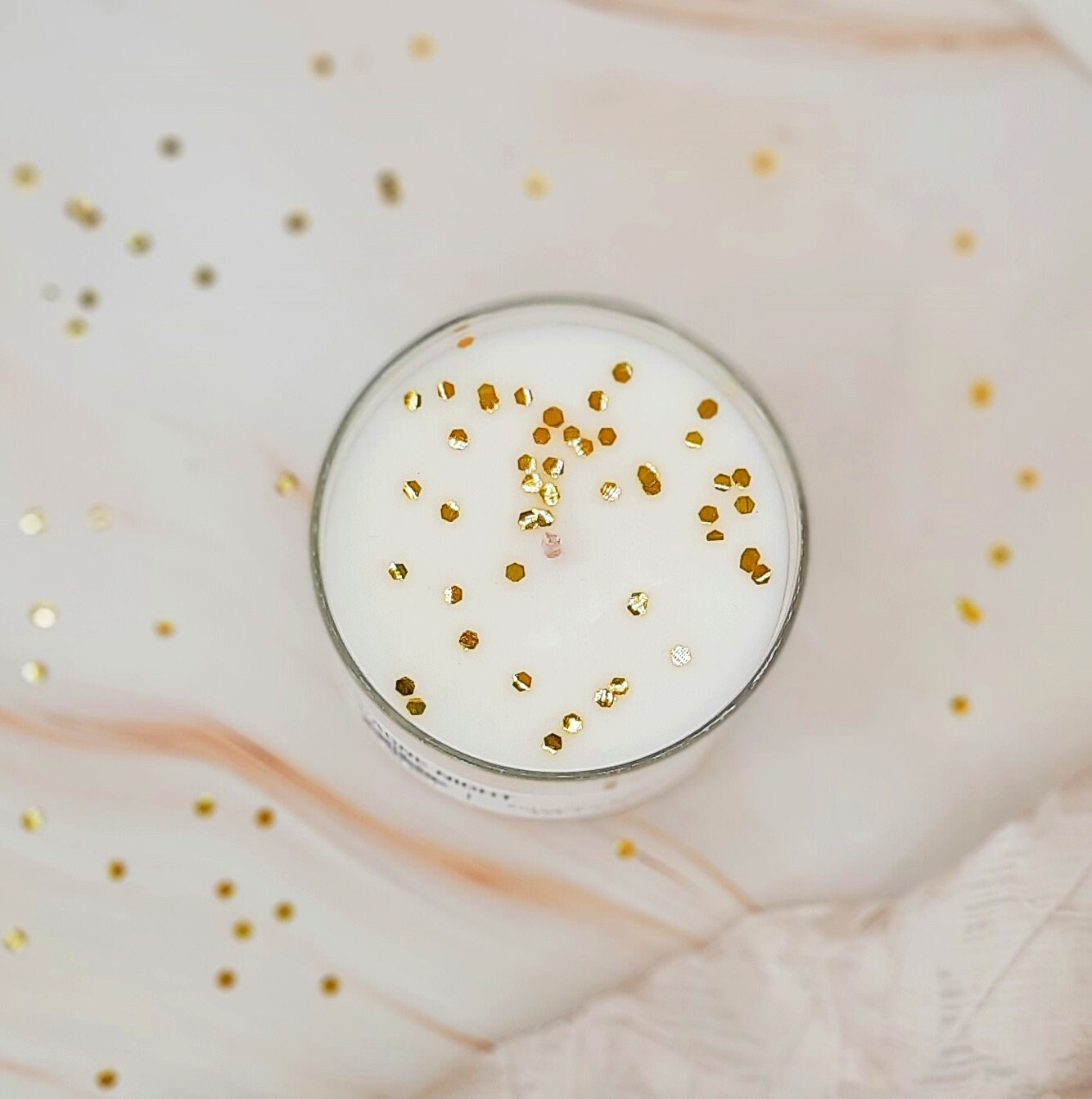 Adorned with biodegradable, large sized gold glitter.  Made from eucalyptus trees. Sparkly and sustainable.  Candle safe glitter.