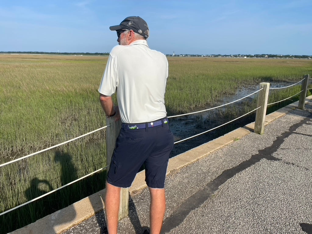 The navy base color has complementary golf motifs that give the design "pop". Also featured is an alligator / croc which frequently show up around the water hazards on many courses -- and definitely on the ones we play around Charleston! Belt is finished with leather in a dark brown color with contrasting top stitching. The buckle is solid brass and will keep its color over years of wear without nicking or tarnishing.