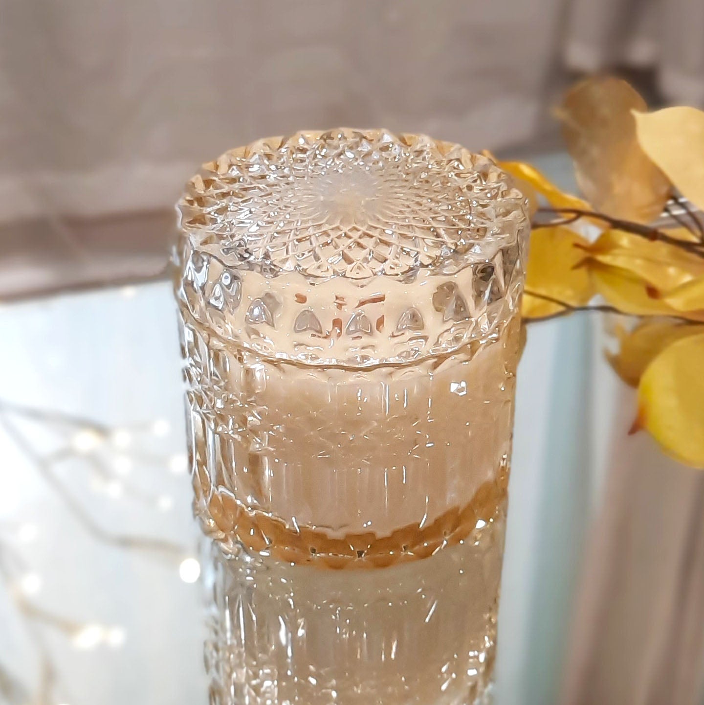 Available in a stunning translucent iridescent or golden champagne color. Vintage inspired candle glass with a heavy-weight crystal design and matching lids. Upcycle and save the glass after purchase to store jewelry, candy, hair clips, and more!
