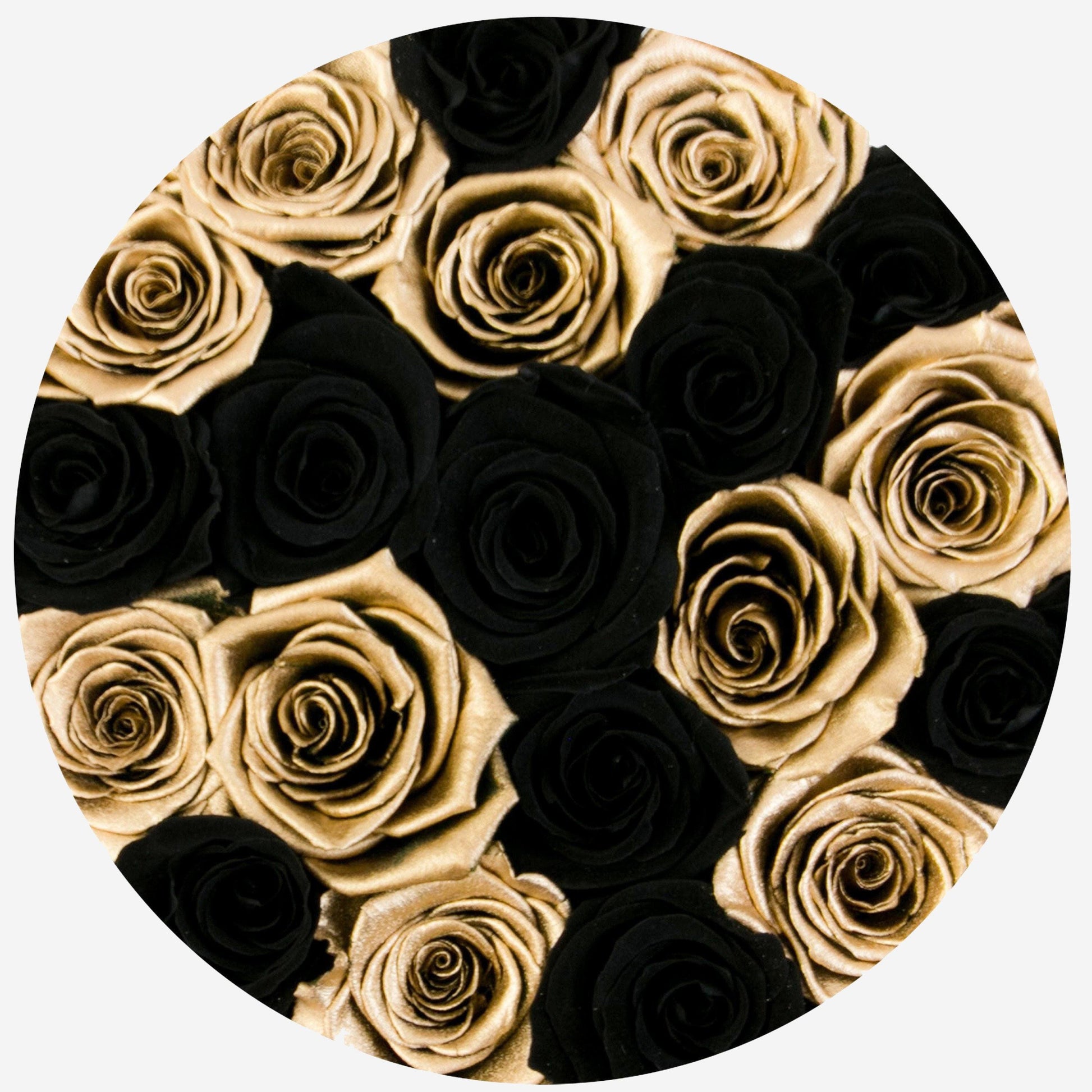 Our Classic collection embodies this stylish simplicity in a gold box filled with black and gold long-lasting roses.