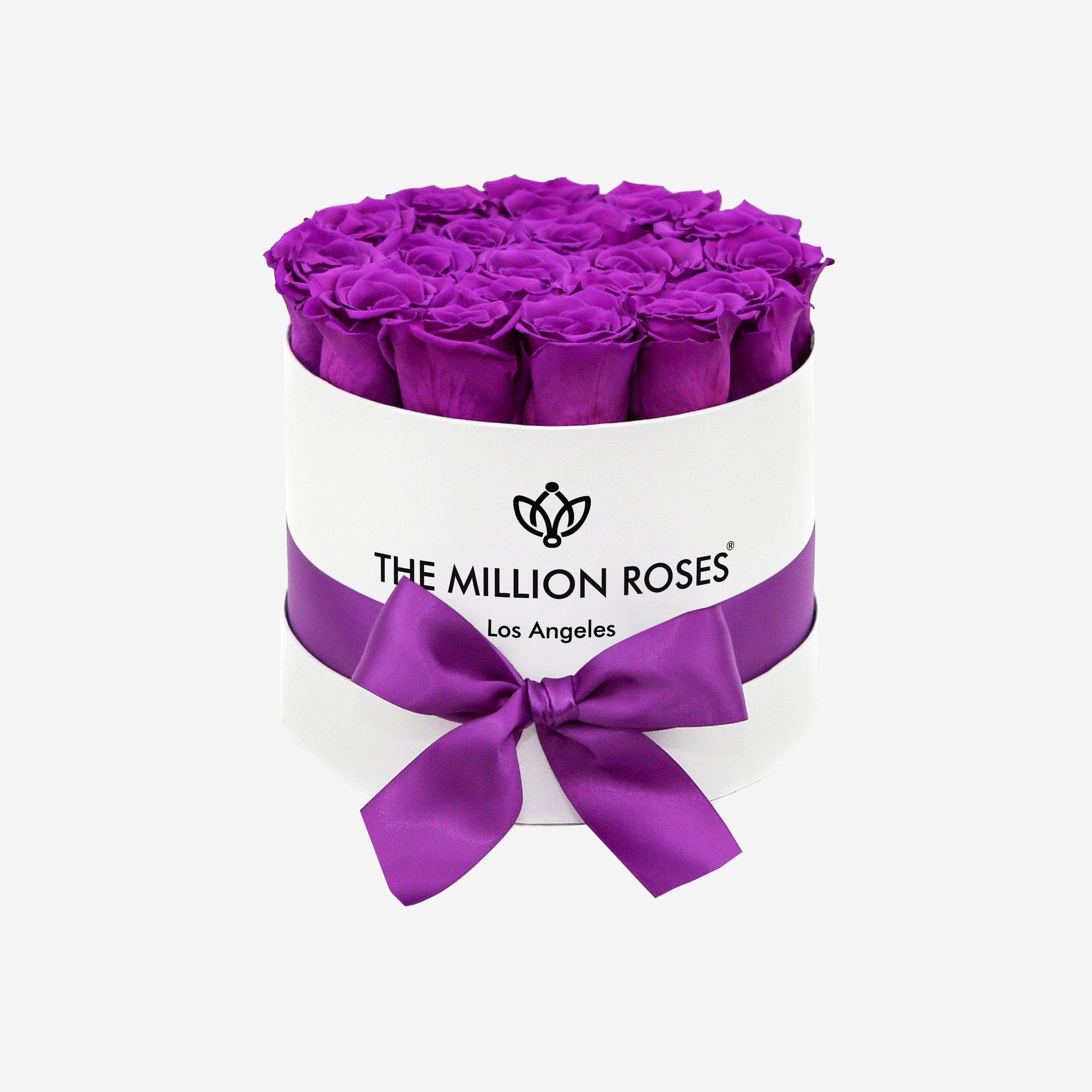 Our Classic collection embodies this stylish simplicity in a white box filled with purple long-lasting roses.