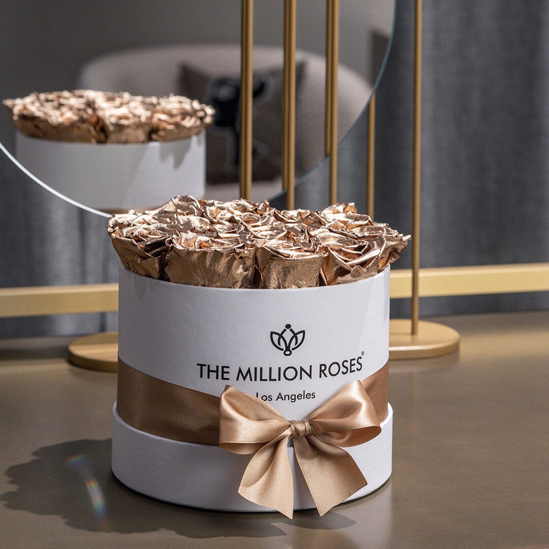Our Classic collection embodies this stylish simplicity in a white box filled with gold long-lasting roses.