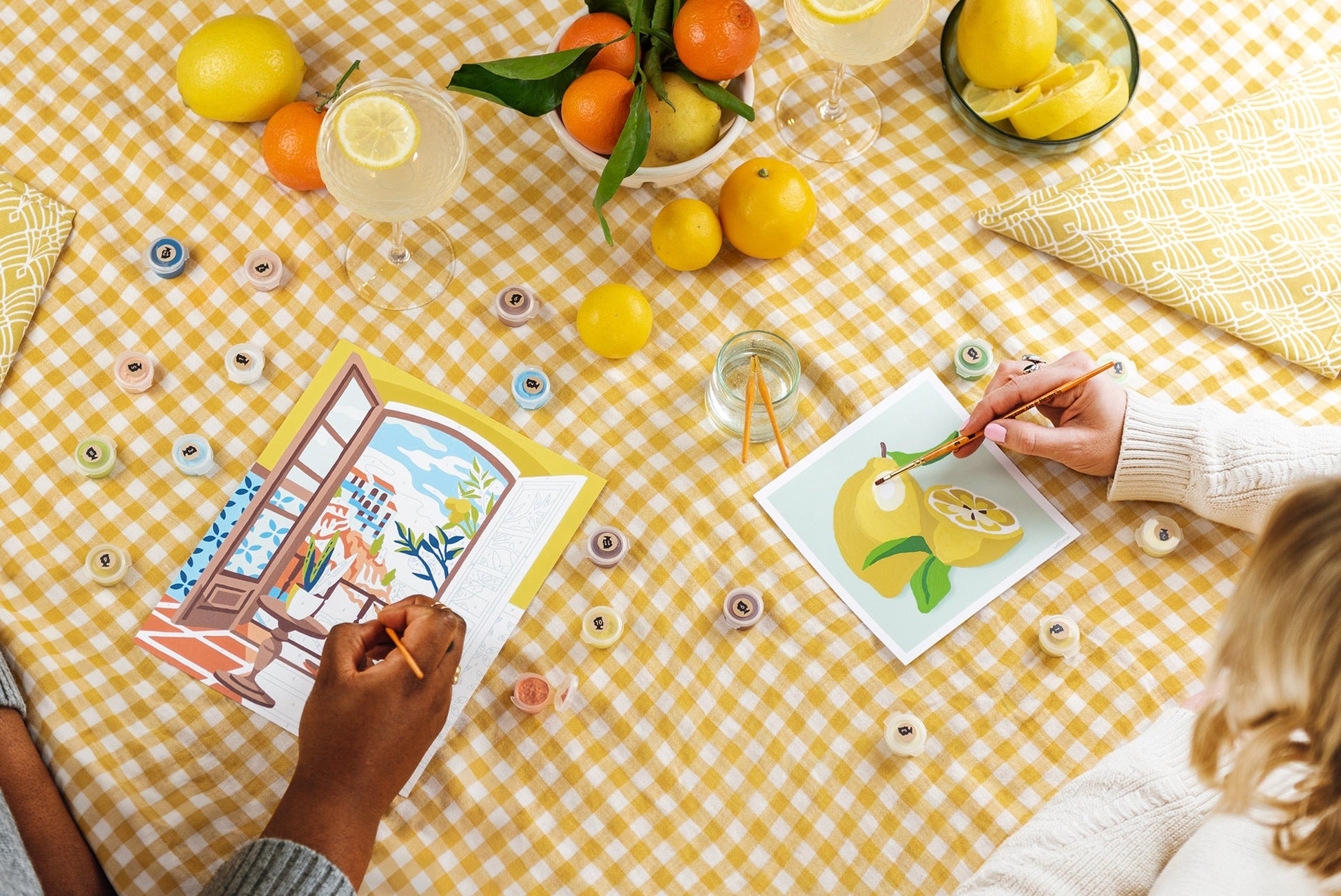 The Coastal Catnap paint-by-number kit features a dreamy terrace view of the Mediterranean’s lapping waves and an airy villa perched on the hillside overlooking the sea while a calico cat peers from the door frame and lemon tree branches peek from the balcony. Completing the acrylic painting can take 12-14 hours. When completed, select a frame at your local craft store and display your new handmade home decor! This DIY craft is recommended for adults and teens age 13 and up.