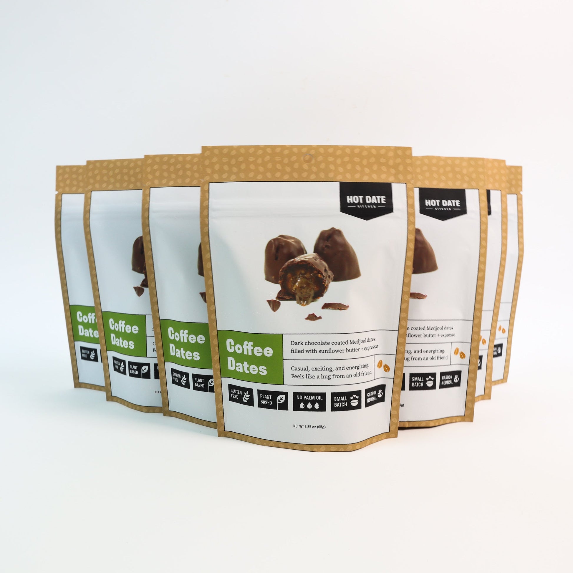 Dark chocolate coated Medjool dates filled with sunflower butter + espresso. Casual, exciting, & energizing. Feels like a hug from an old friend.