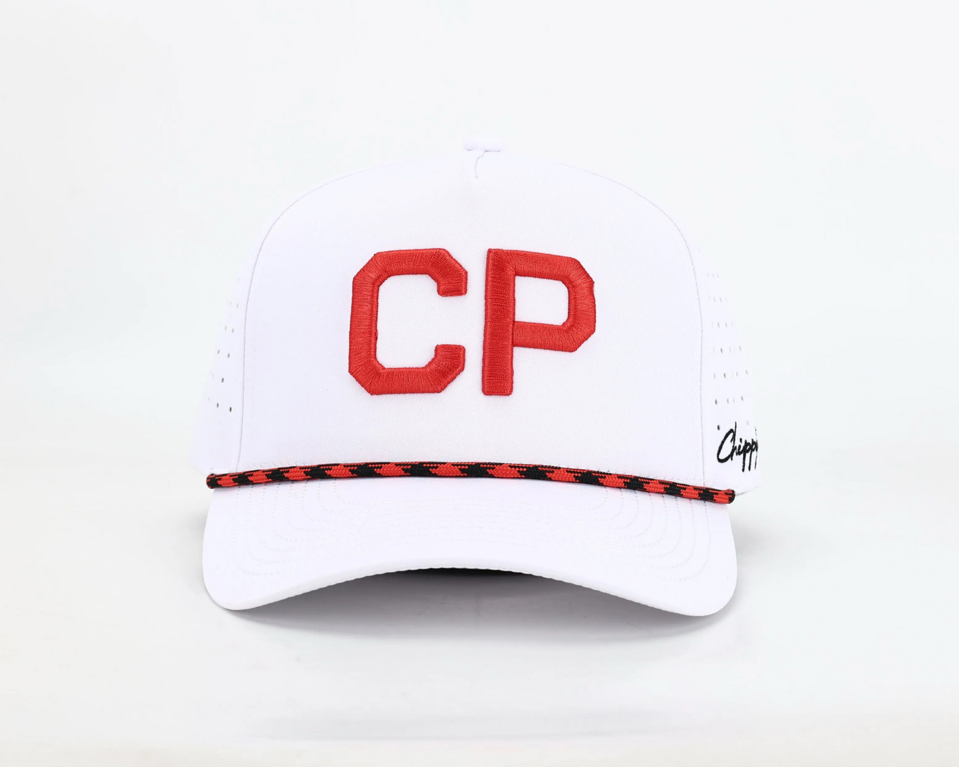 Waterproof material, sweatproof band. 5 panel classic laser cut drilled hole hat in color white with red rope.  CP 3D embroidery on the front and Chippopotamus name on the side.
