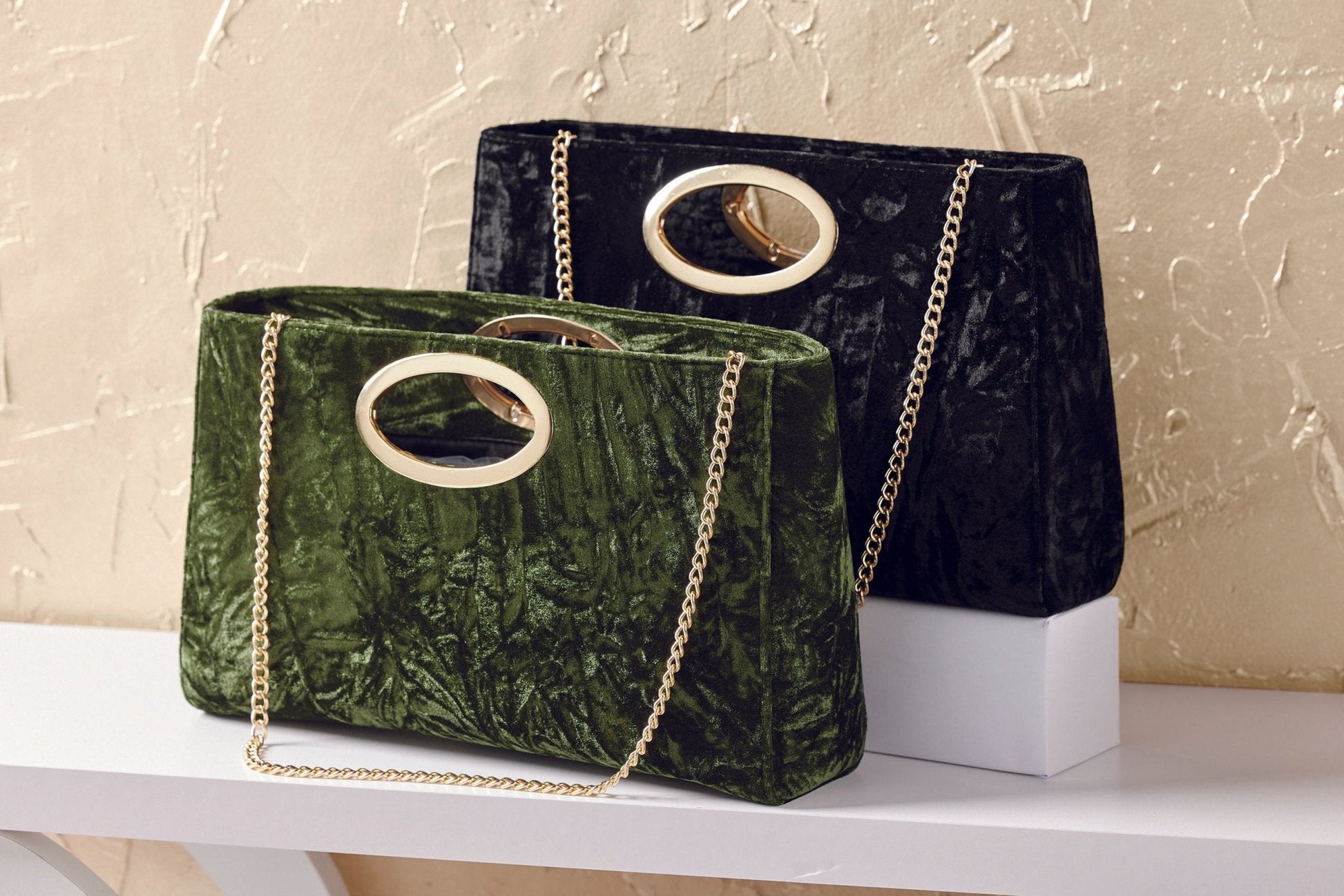 Accessorize in style with this outfit-completing handbag in lush, plush crushed velvet. Features an open top, metallic hand holes, an inside side pocket, and a removable chain strap. 14 1/2" x 3 1/2" x 9". Fabric and manmade materials. Imported.